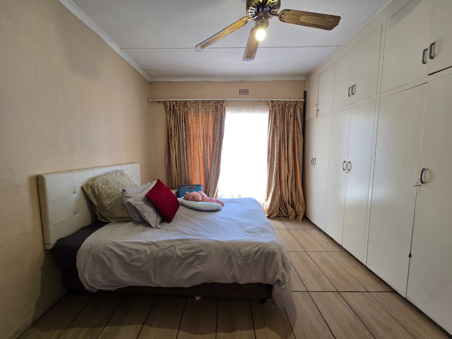 The home boasts four spacious bedrooms, three of which are fitted with built-in cupboards, providing plenty of storage space. The master bedroom enjoys the added benefit of a fully equipped ensuite bathroom, offering privacy and comfort. The remaining bedrooms are serviced by a common bathroom featuring a bathtub/shower, toilet, and basin.