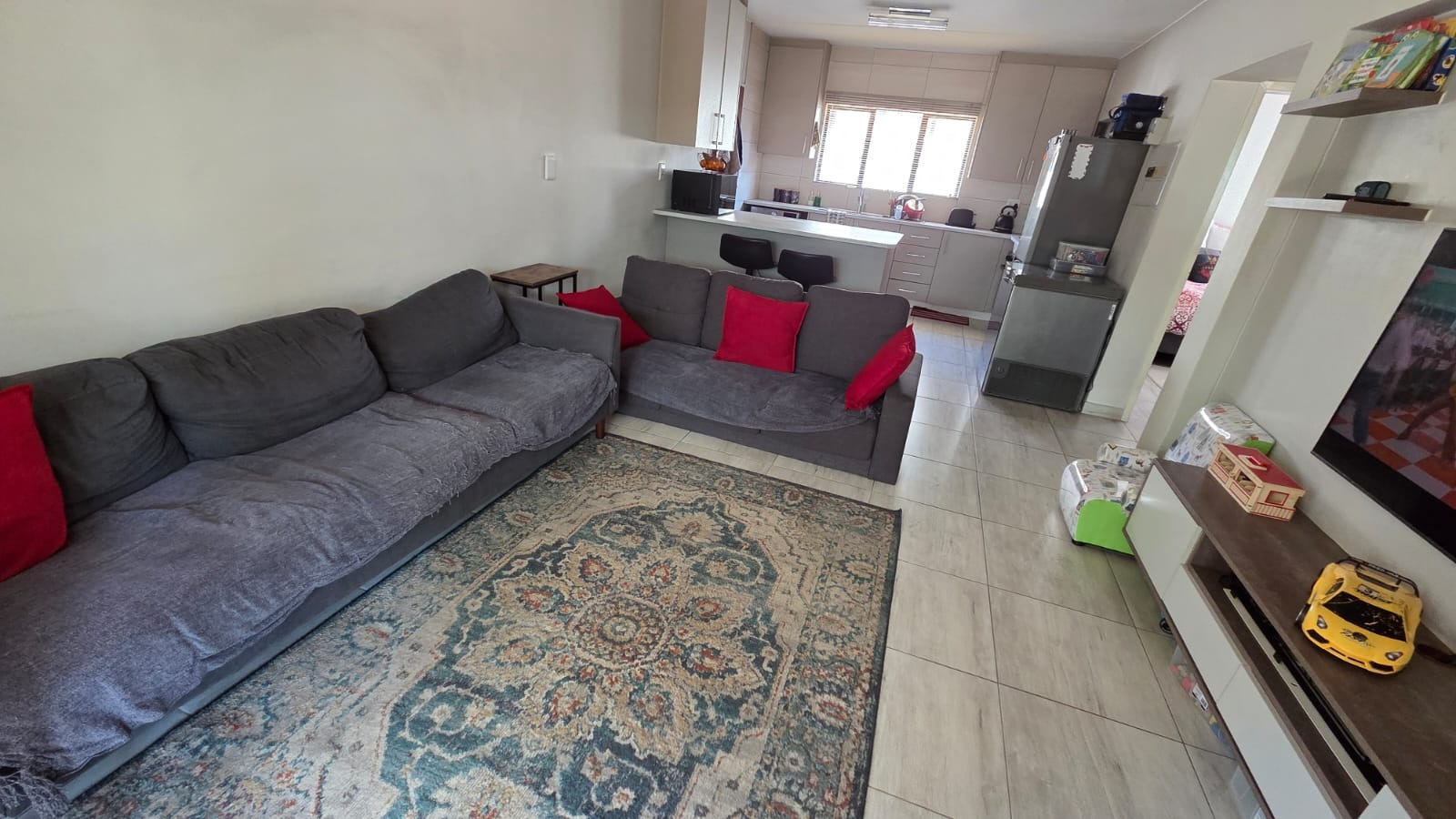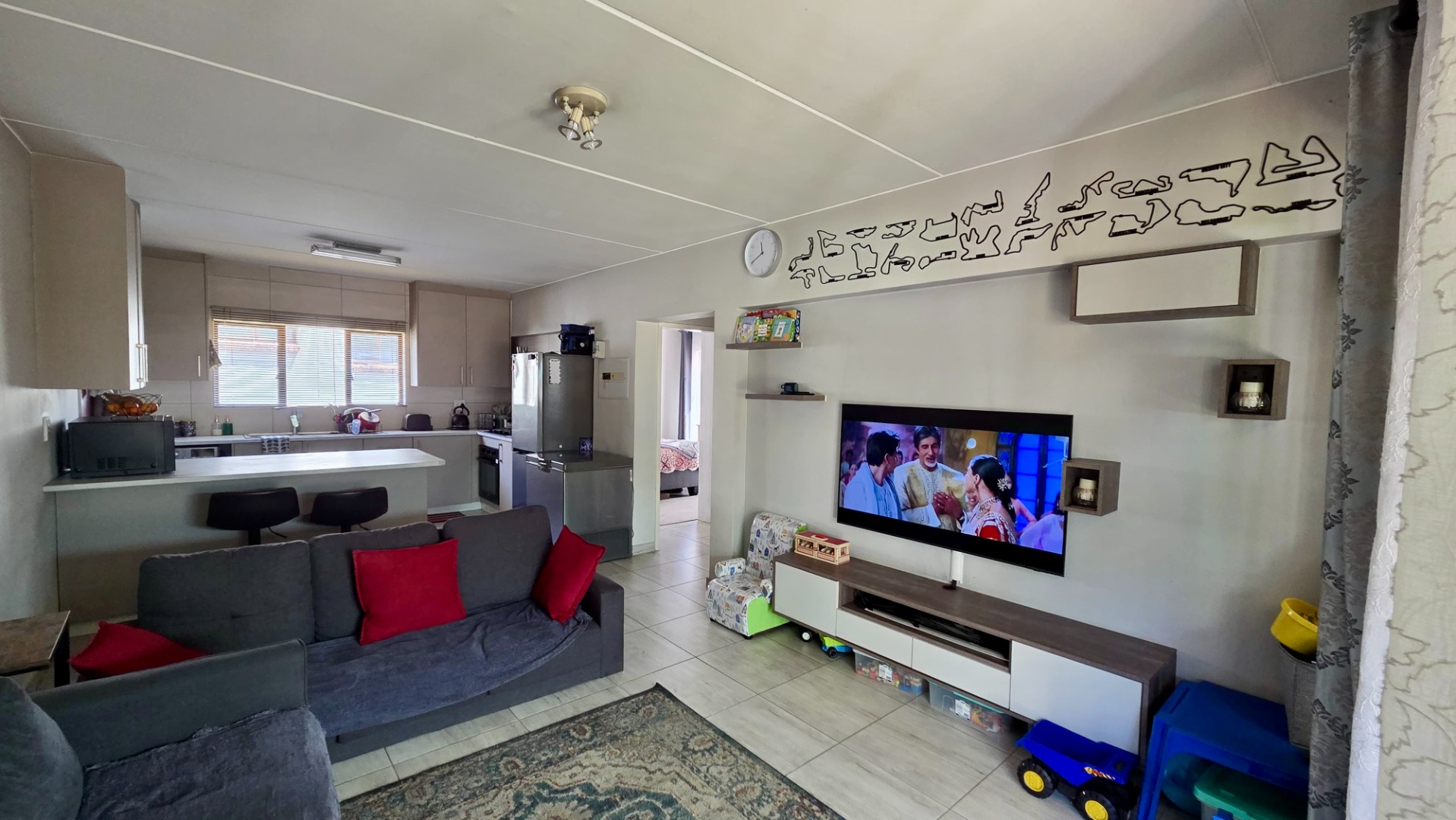 Step inside and be welcomed by open-plan tiled living spaces designed for style, comfort and easy maintenance. The contemporary kitchen is a true highlight — boasting a modern layout, dual electric and gas stove plates for uninterrupted cooking, electric oven, ample cabinetry and dedicated space for your washing machine and fridge. A convenient breakfast counter flows seamlessly into the dining/ lounge area flooded with natural light and with a fitted TV stand and floating shelves creating a warm and inviting atmosphere.