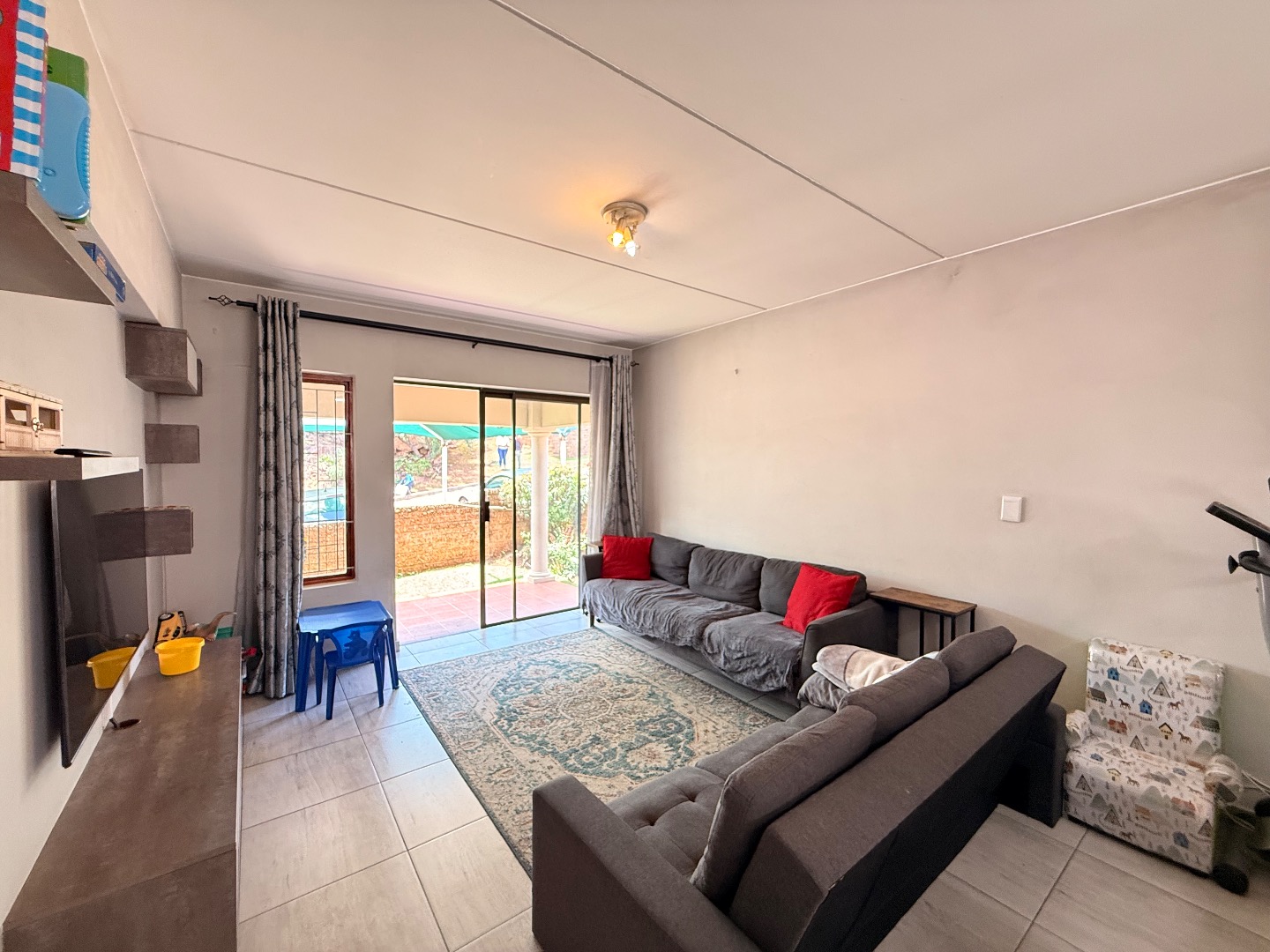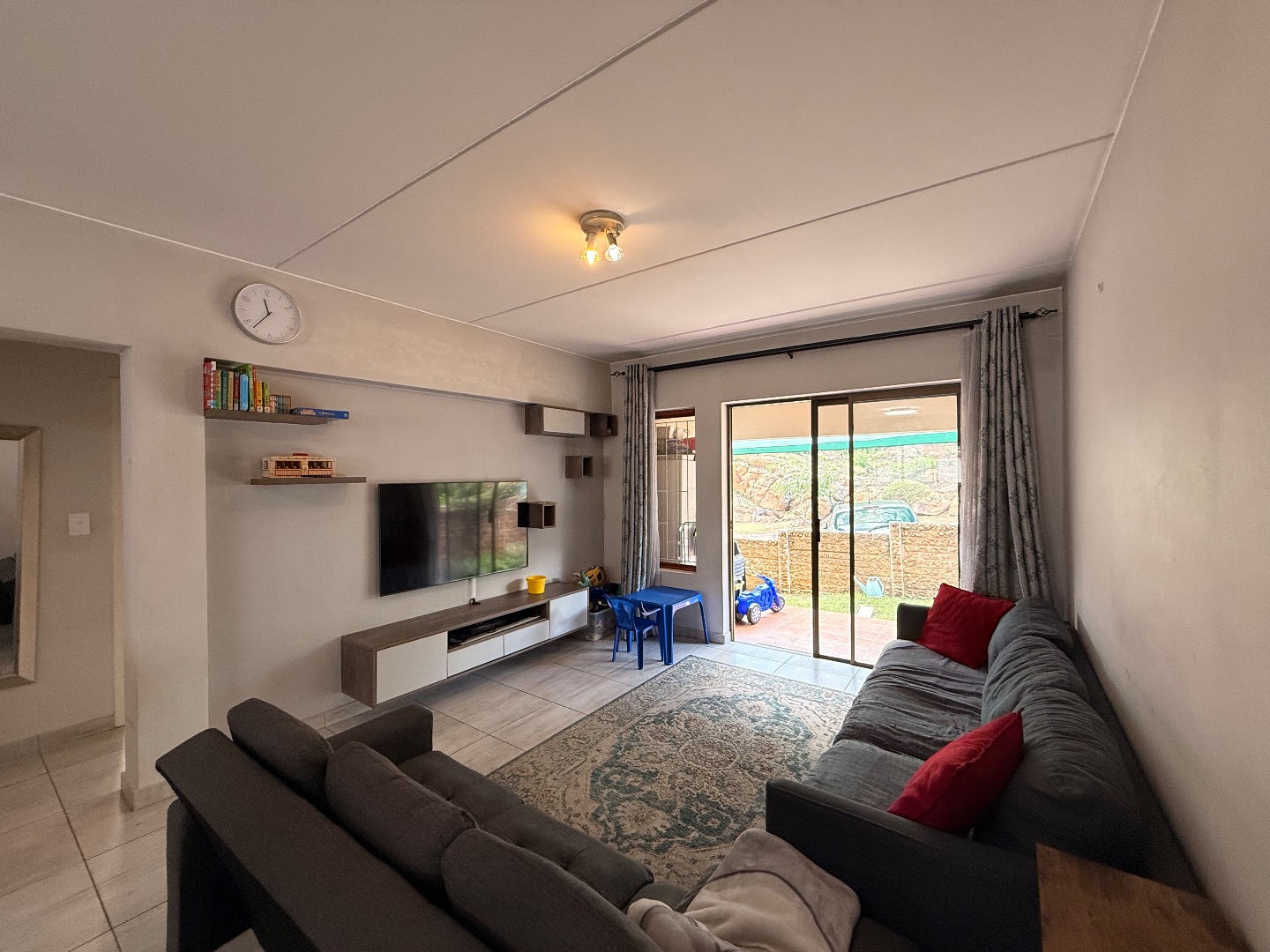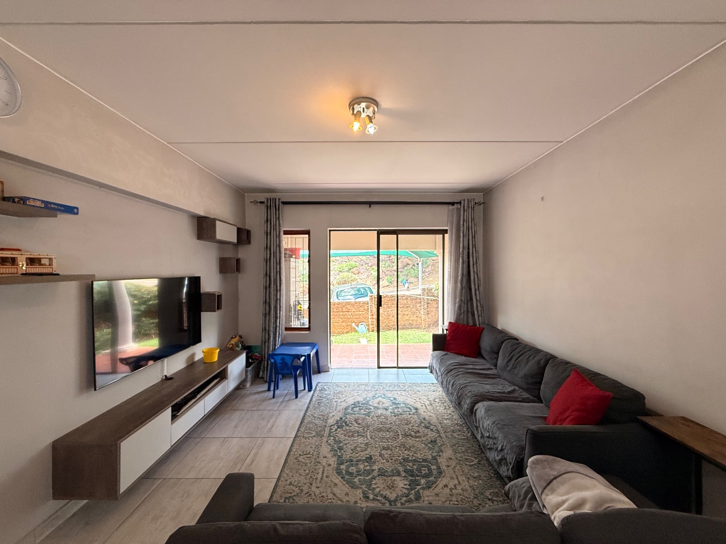 Step inside and be greeted by a spacious lounge already fitted with a TV stand and floating shelving — because who doesn’t love a bit of stylish convenience?