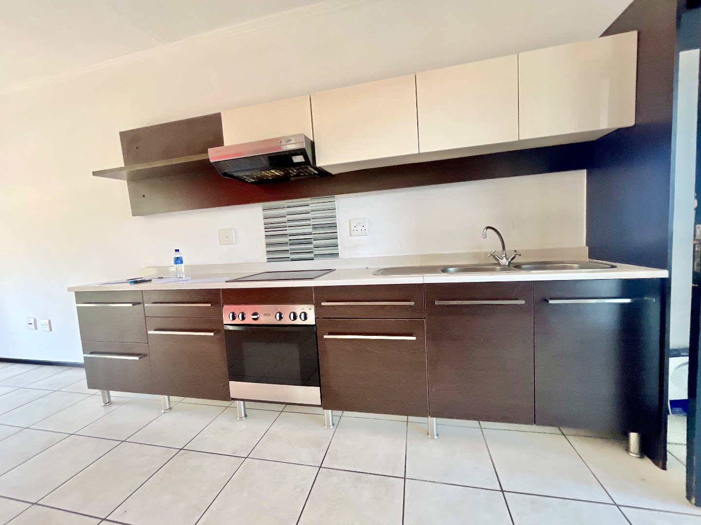 Step inside to an inviting open-plan layout, designed for comfortable daily living and entertaining. The modern kitchen is a highlight, featuring stylish two-tone cabinetry, sleek countertops, a double sink, and integrated appliances including a hob, oven, and extractor fan. Ample counter and storage space make meal preparation a breeze. Tiled flooring extends throughout the apartment, ensuring easy maintenance and a cohesive aesthetic.