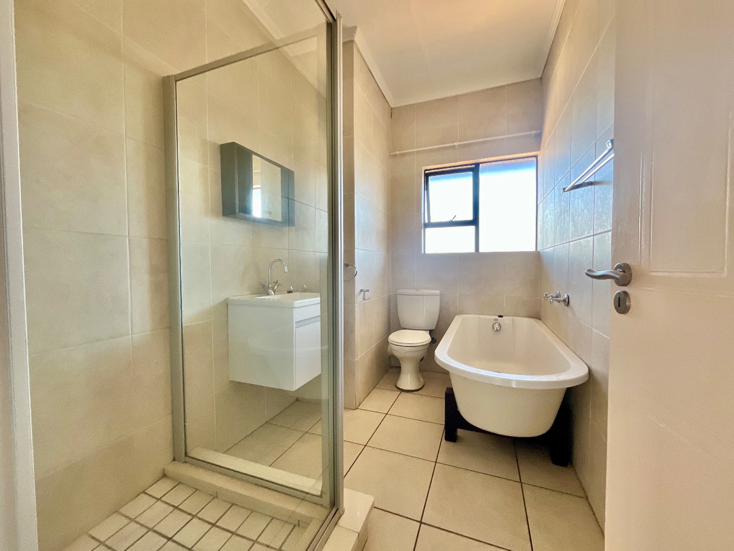 The apartment offers two well-proportioned bedrooms, providing comfortable private retreats. The contemporary bathroom is thoughtfully designed, equipped with both a walk-in glass shower and a freestanding bathtub, a modern floating vanity, and a window for natural light and ventilation. The spacious lounge, designated as a family TV room, benefits from abundant natural light and seamlessly connects to a private balcony, offering pleasant green views – perfect for relaxation.