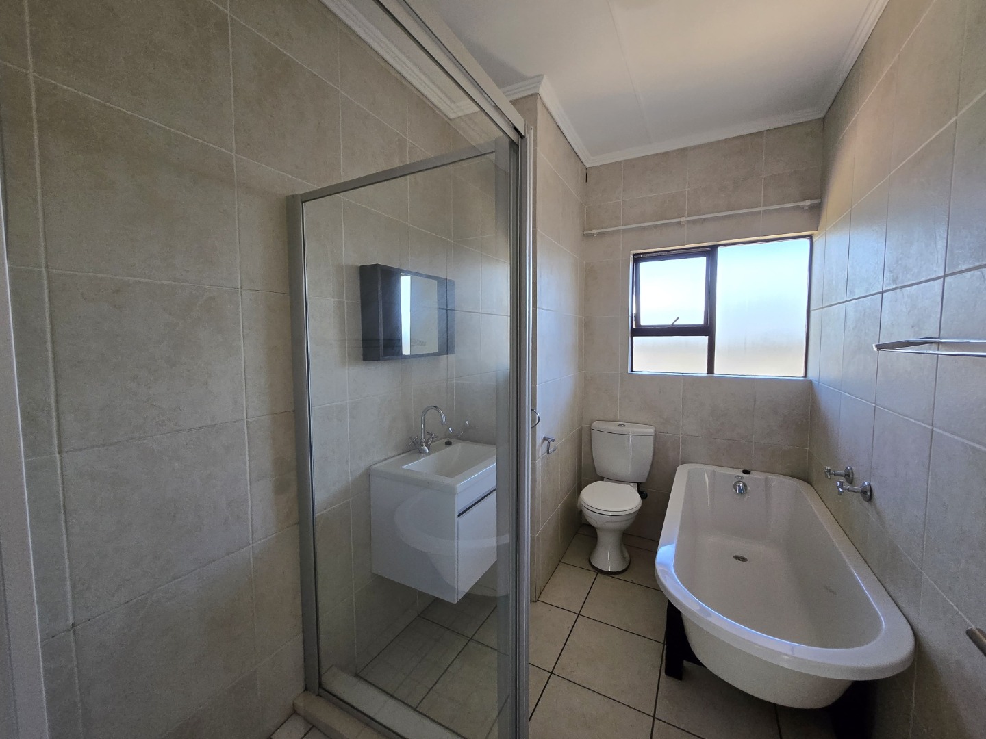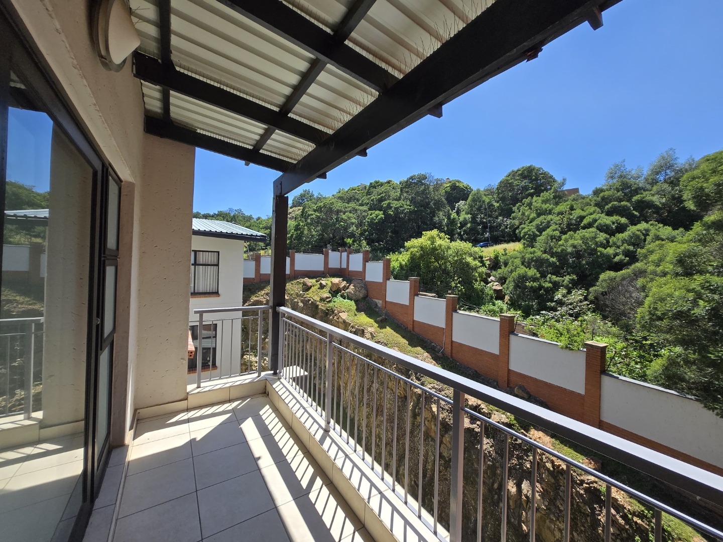 This inviting 68 sqm apartment, located in a secure complex in Winchester Hills, Johannesburg, offers a comfortable and modern living experience. The interior boasts an open-plan layout, seamlessly connecting the living area with a contemporary kitchen. The kitchen features stylish dark base cabinetry complemented by lighter upper units, providing a functional space for daily meal preparation. Tiled flooring extends throughout the apartment, ensuring easy maintenance and a clean aesthetic, while freshly painted white walls offer a neutral canvas for personalisation. The residence comprises two well-proportioned bedrooms, each designed for comfort. One bedroom includes a practical built-in wardrobe, offering ample storage solutions. The single bathroom is a highlight, featuring a full suite with both a glass-enclosed shower and a freestanding bathtub, alongside a modern wall-mounted vanity. Natural light fills the rooms, creating a bright and airy atmosphere. Step outside to a private, covered balcony, a true extension of the living space. This outdoor area provides scenic views of a lush, green hillside, perfect for relaxation or entertaining. The property also includes the convenience of a single garage and an additional parking bay, catering to your vehicle needs. Residents benefit from the complex's well-maintained garden and paved areas. Security is a priority within this complex, featuring 24-hour security, an access gate, and a security gate, providing peace of mind for residents. This ensures a safe and secure environment for all. Situated in the desirable Winchester Hills, Johannesburg, this property offers convenient access to local amenities and transport routes, making it an ideal choice for those seeking a balanced lifestyle. **Key Features:** * Two Bedrooms, One Bathroom * Open-Plan Living and Modern Kitchen * Private, Covered Balcony with Scenic Views * Single Garage and Additional Parking * Tiled Flooring Throughout * Full Bathroom with Shower and Freestanding Bathtub * Built-in Wardrobe * 24-Hour Security and Access Gate * 68 sqm Floor Size