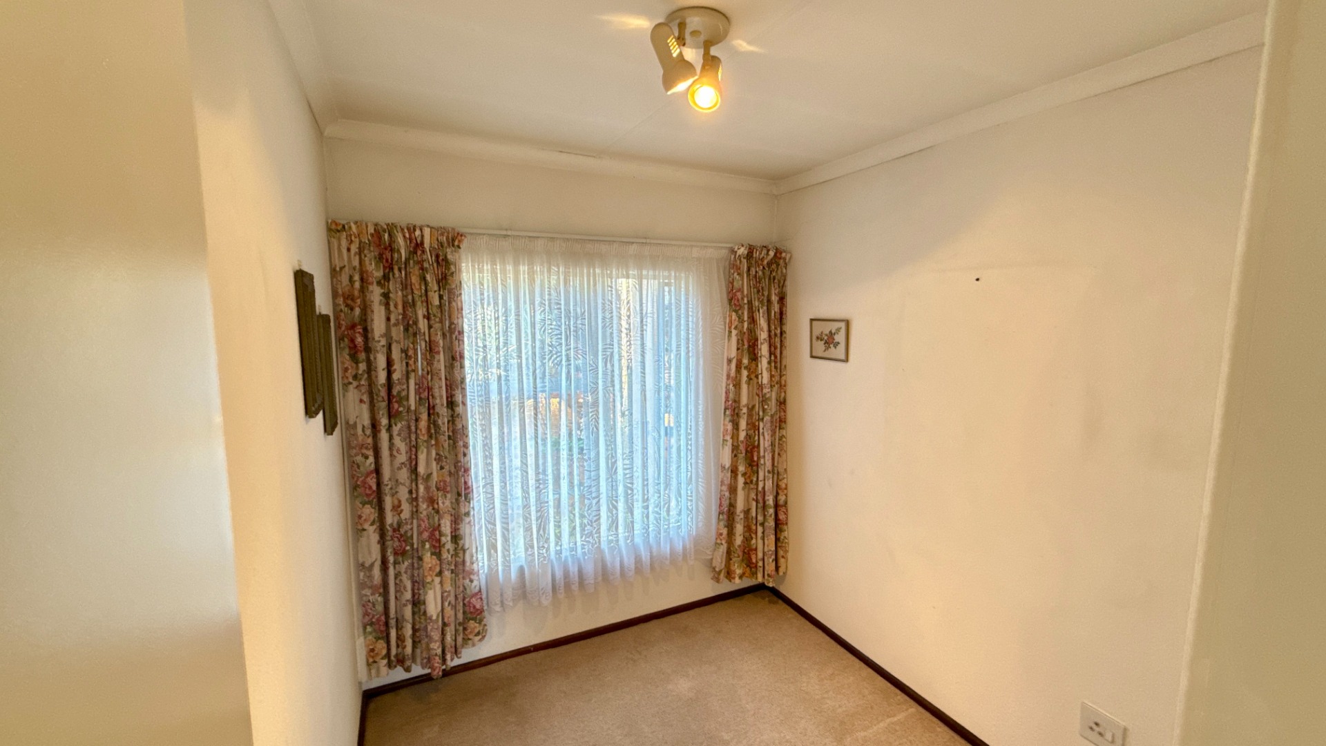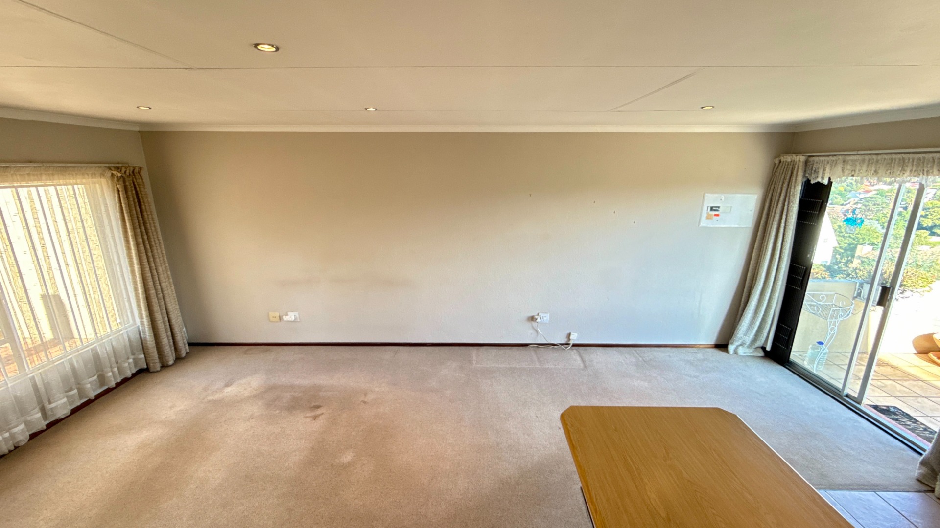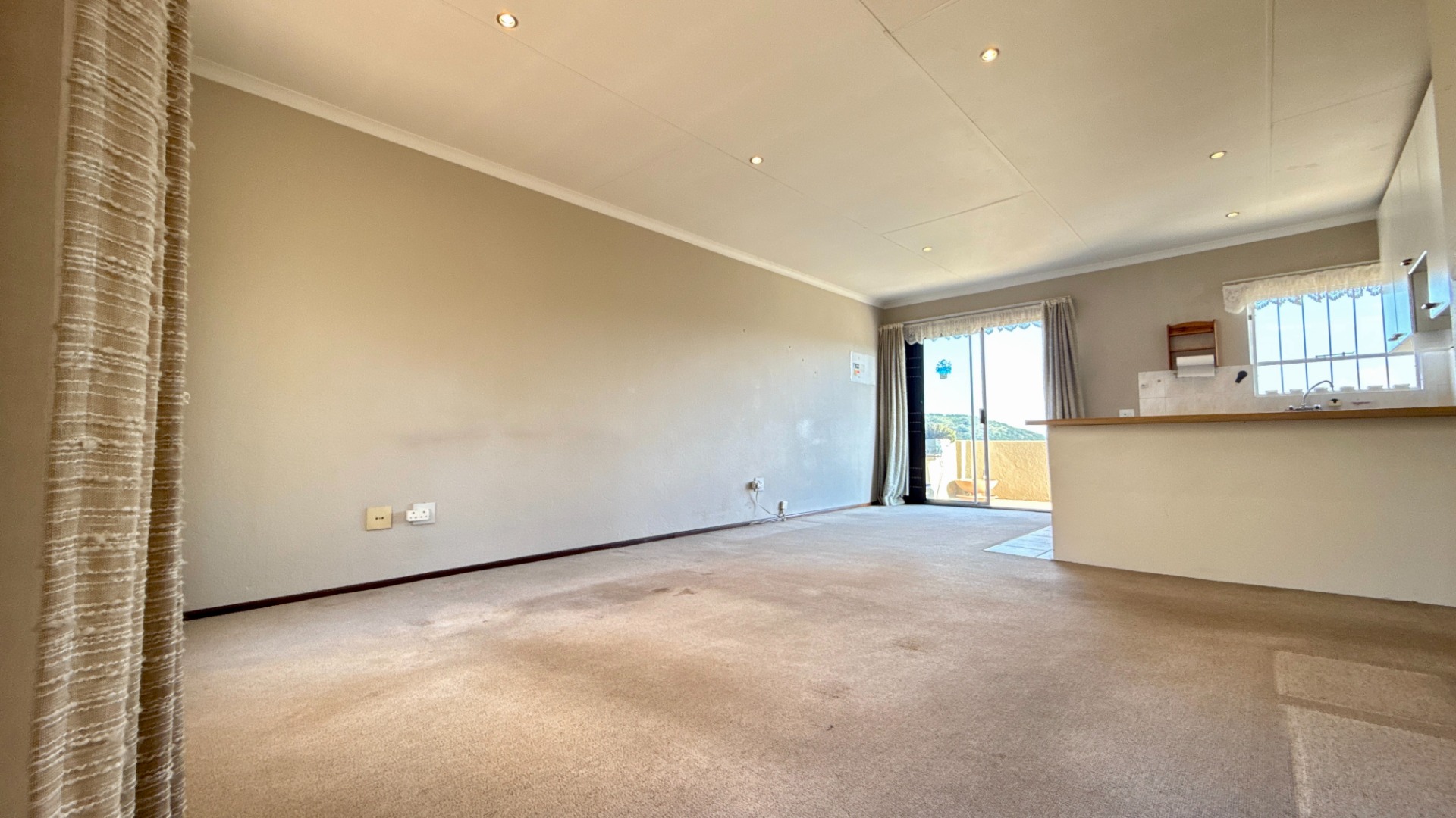 - Open plan lounge area with warmly carpeted floors and downlights installed