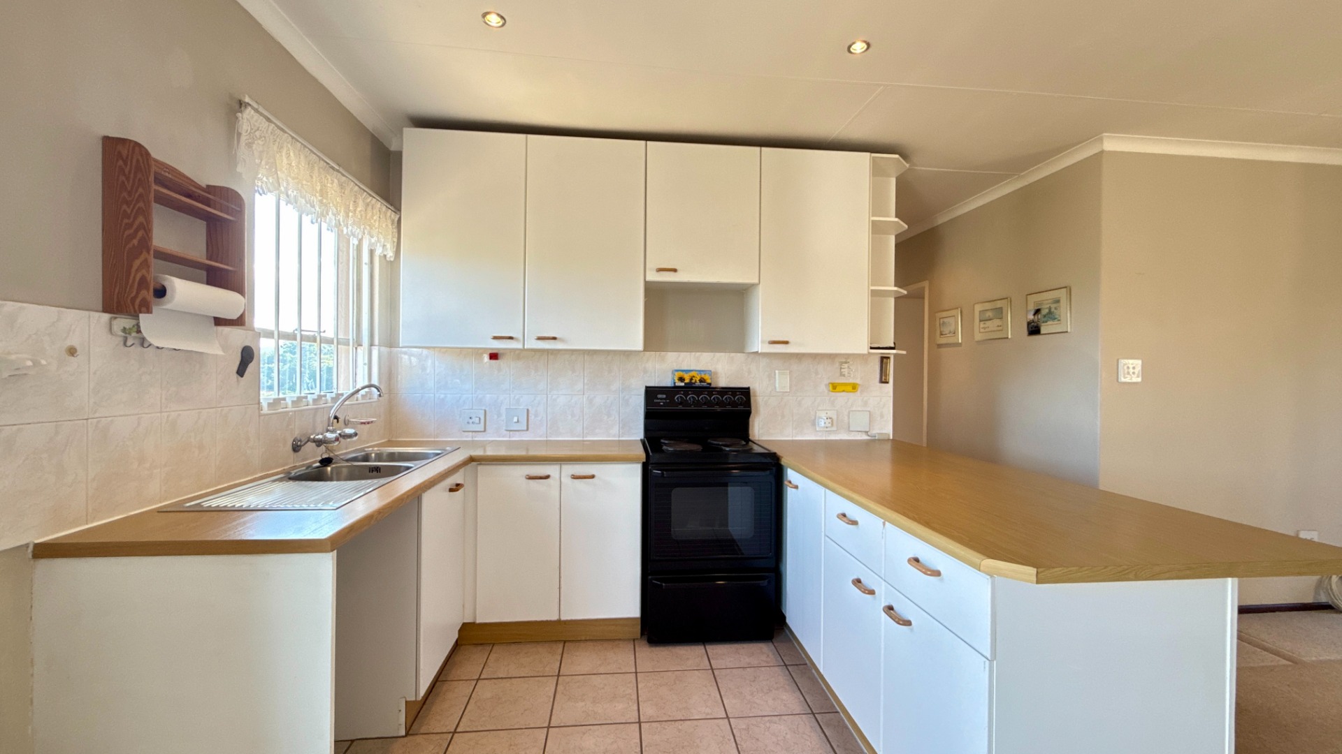Step into a bright and inviting open-plan lounge area, featuring warmly carpeted floors and stylish downlights—a perfect space for relaxation and entertaining. The lounge seamlessly connects to a super neat kitchen, fitted with ample built-in cupboards and generous countertop space, making meal preparation a breeze.
