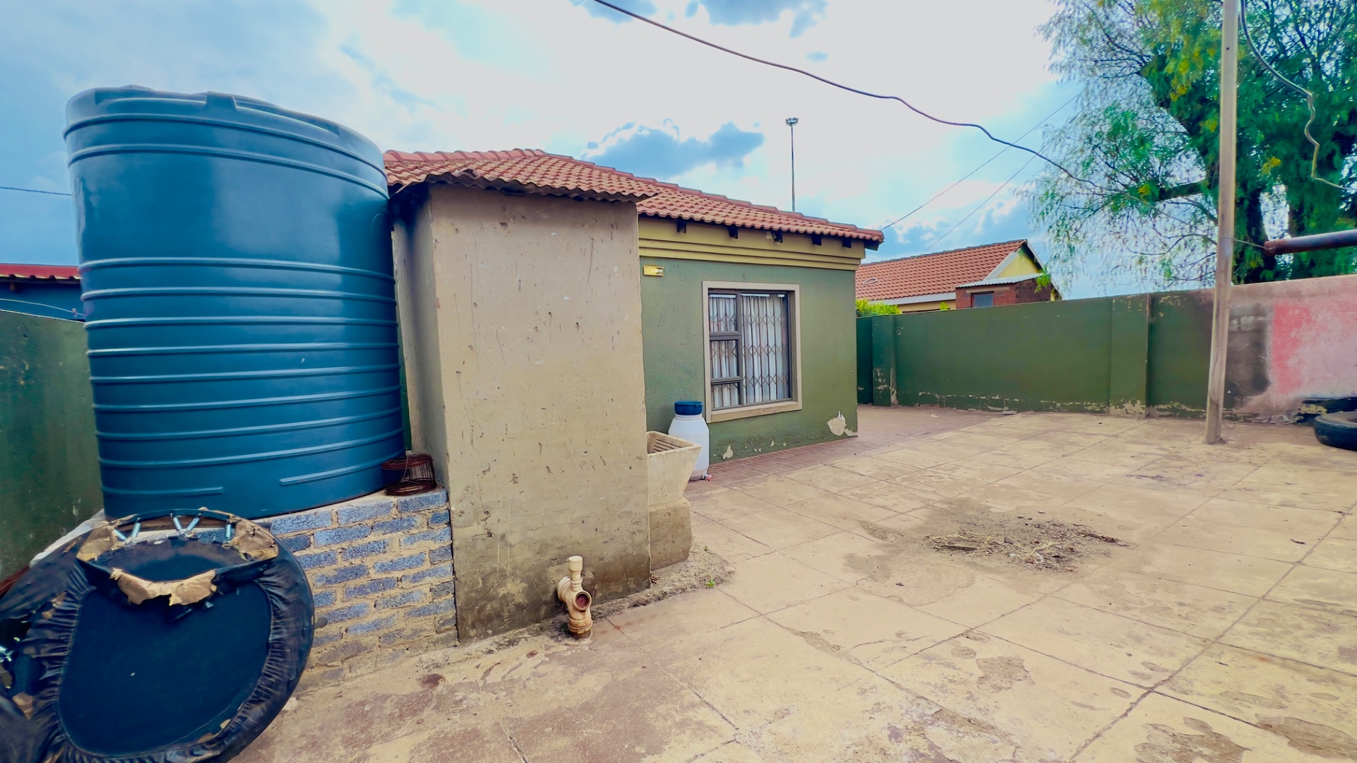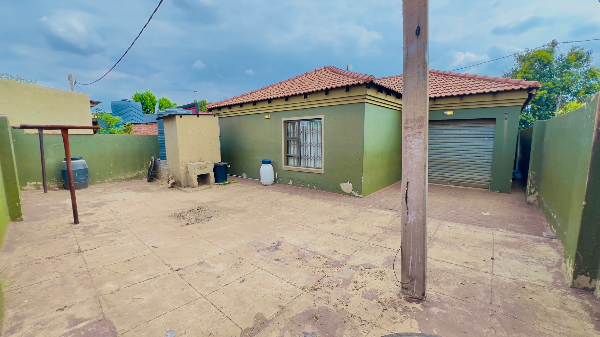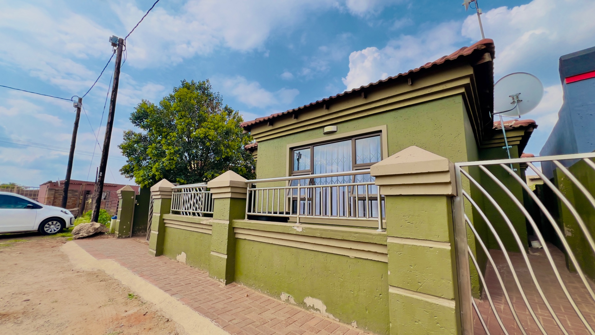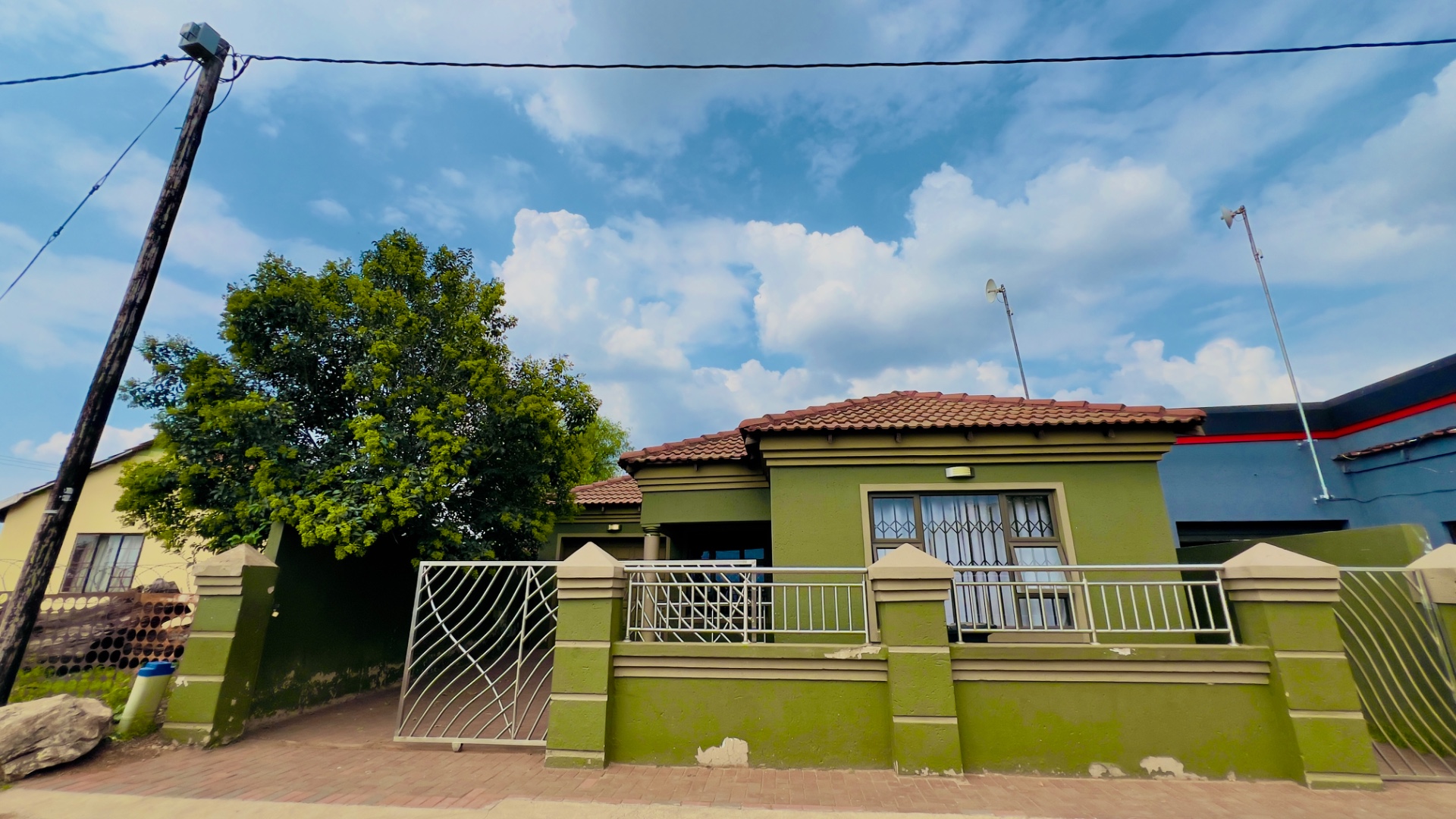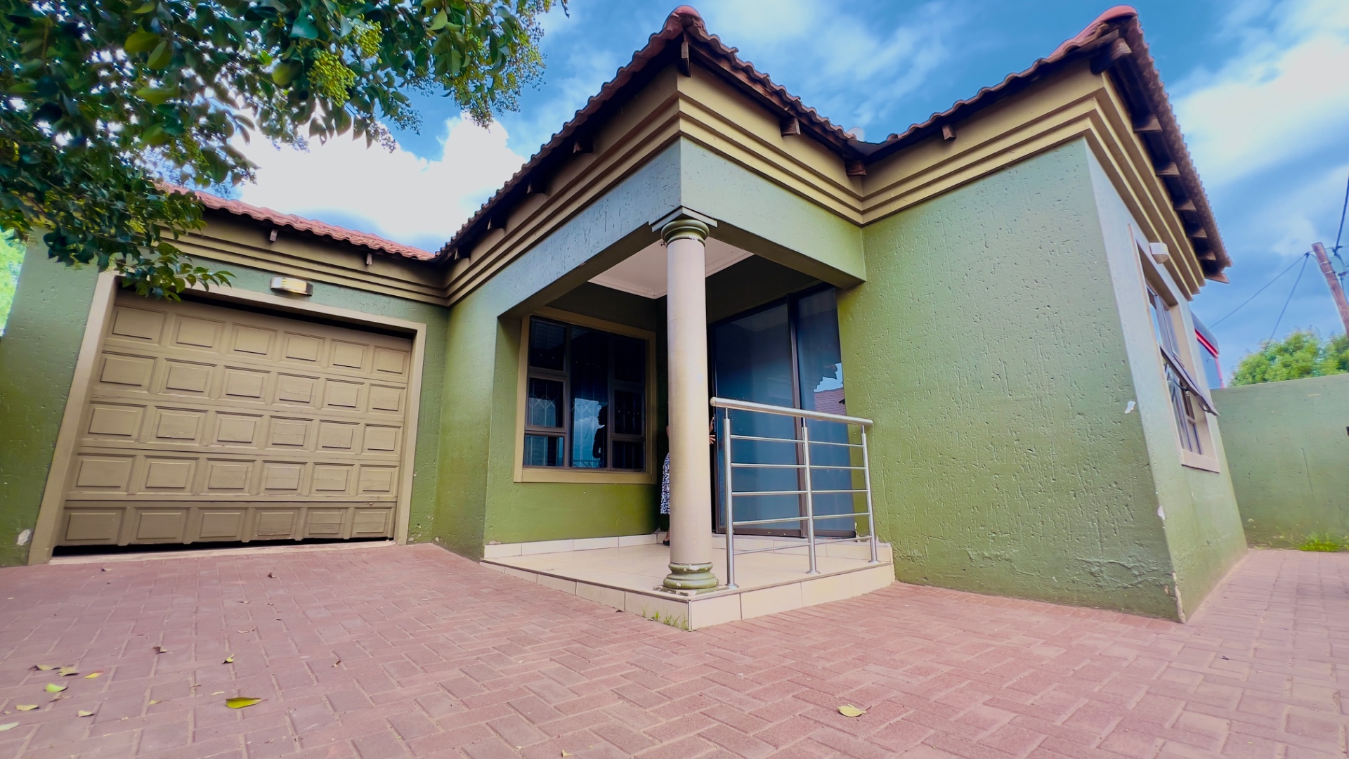 This inviting single-story residence in Zonkezizwe, Katlehong, offers a blend of comfort and security. The property immediately impresses with its distinctive olive green exterior and classic terracotta-tiled roof, creating a welcoming first impression. A neatly paved driveway leads to an integrated single garage, complemented by a charming front porch featuring a modern metal railing. The entire frontage is secured by a perimeter wall with stylish gates and windows fitted with security bars, ensuring peace of mind.