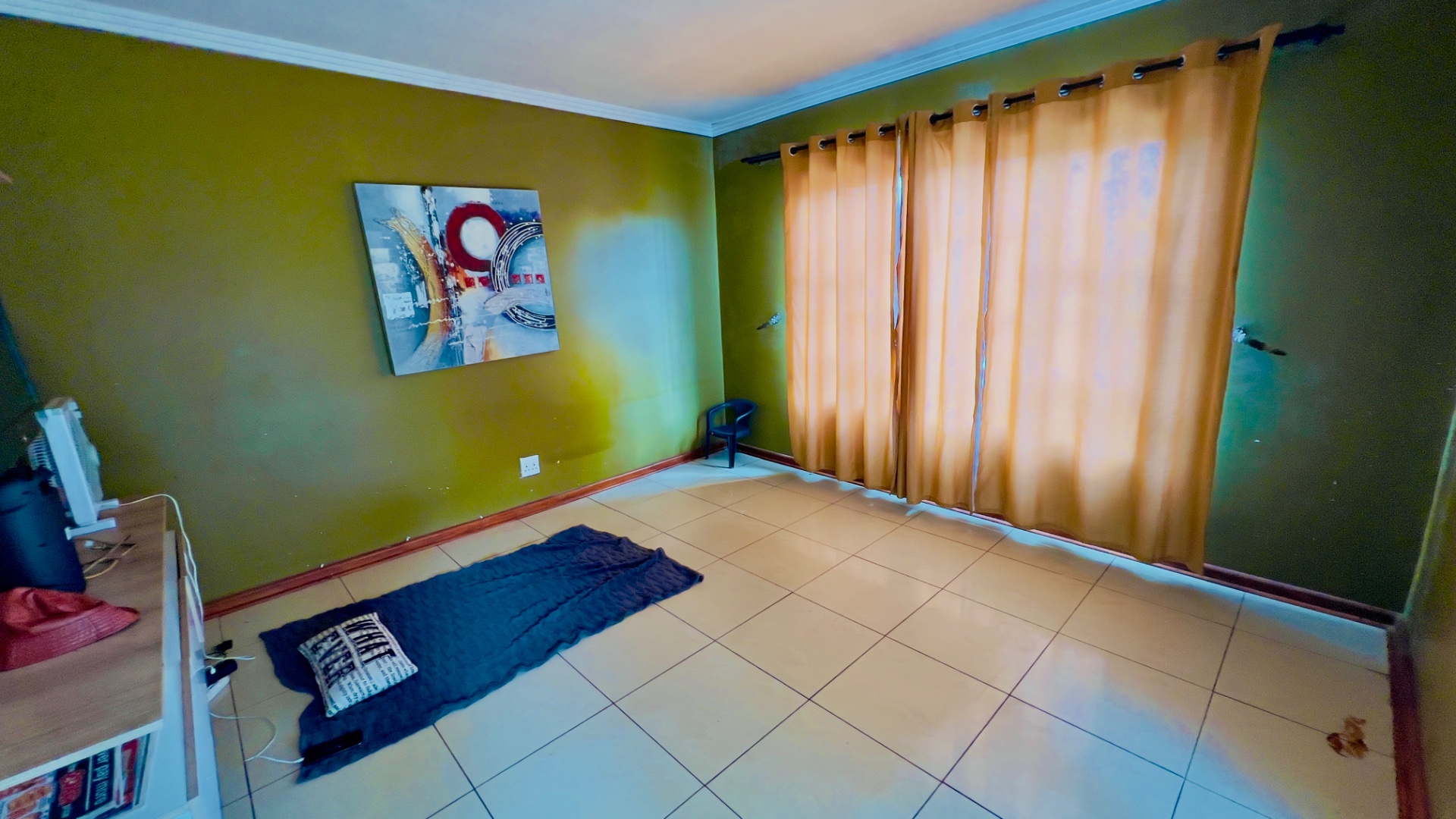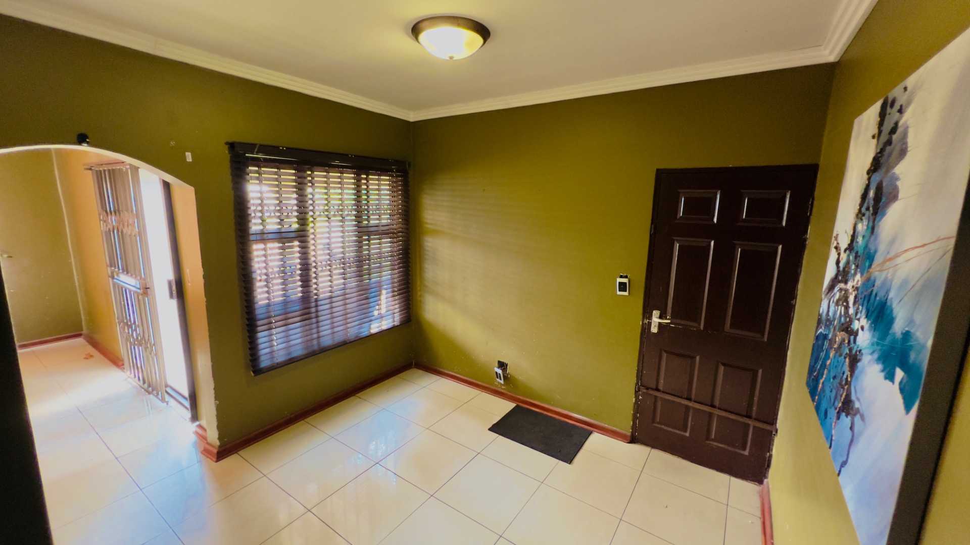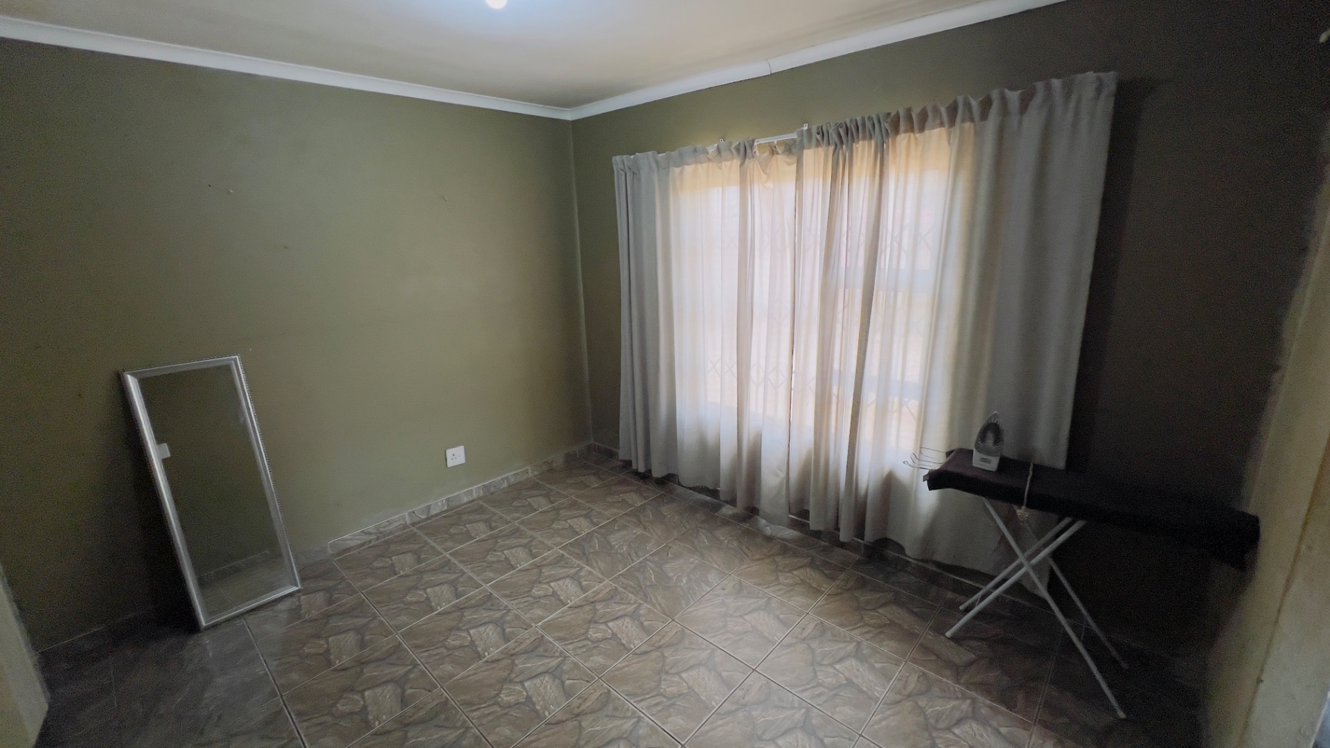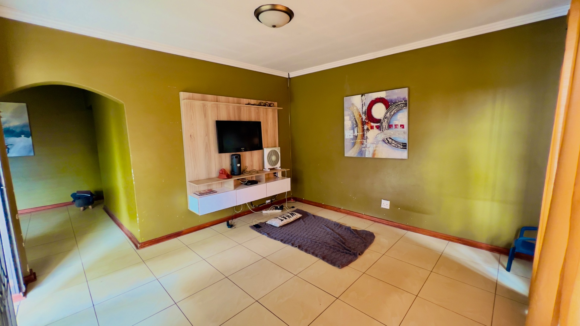 Inside, the home presents a practical and well-defined layout. The living spaces include a comfortable lounge and a dedicated dining room, providing ample area for relaxation and entertaining. The functional kitchen is ready to cater to your culinary needs. Throughout the main living areas, light-colored tiled flooring and a continuation of the olive-green wall palette create a cohesive and easy-to-maintain environment.