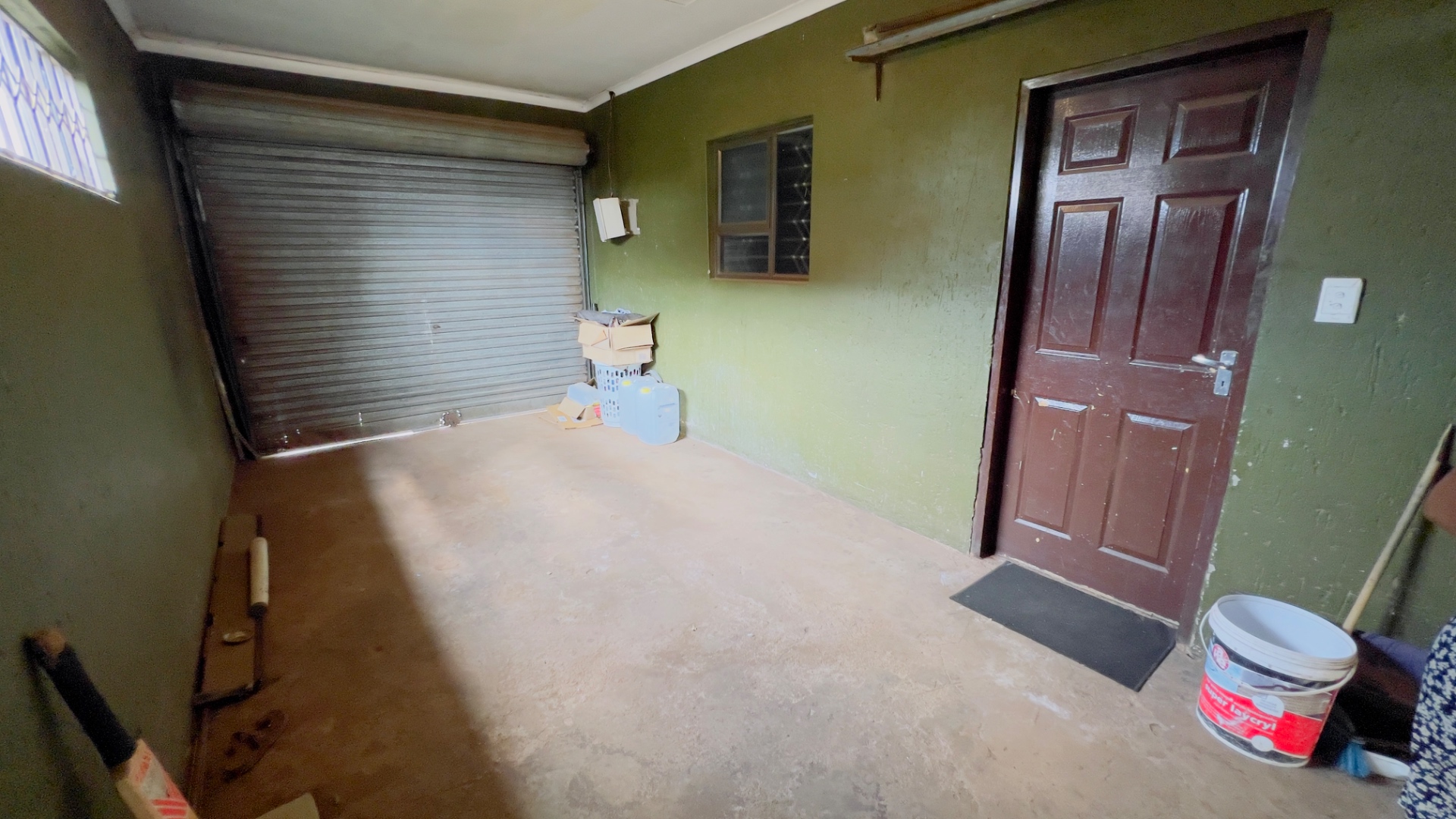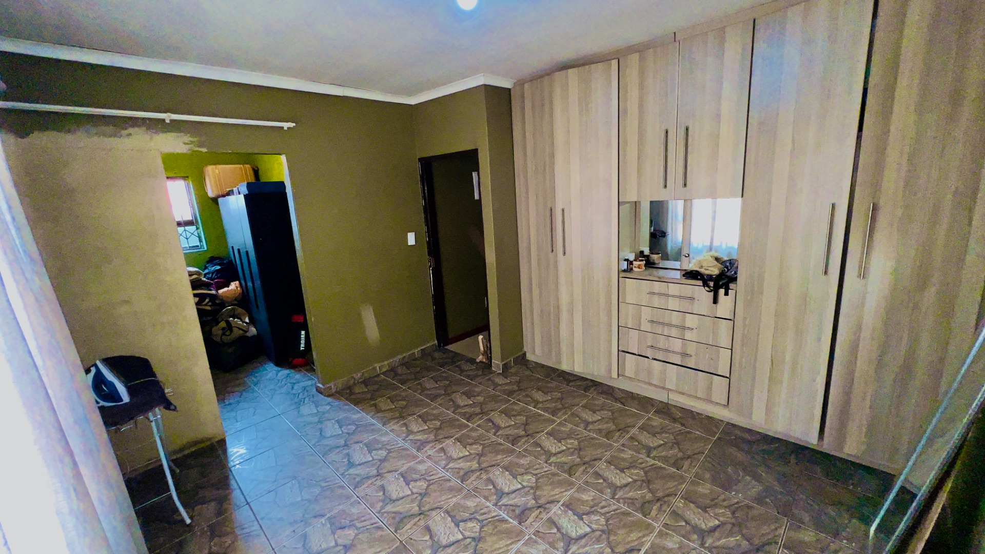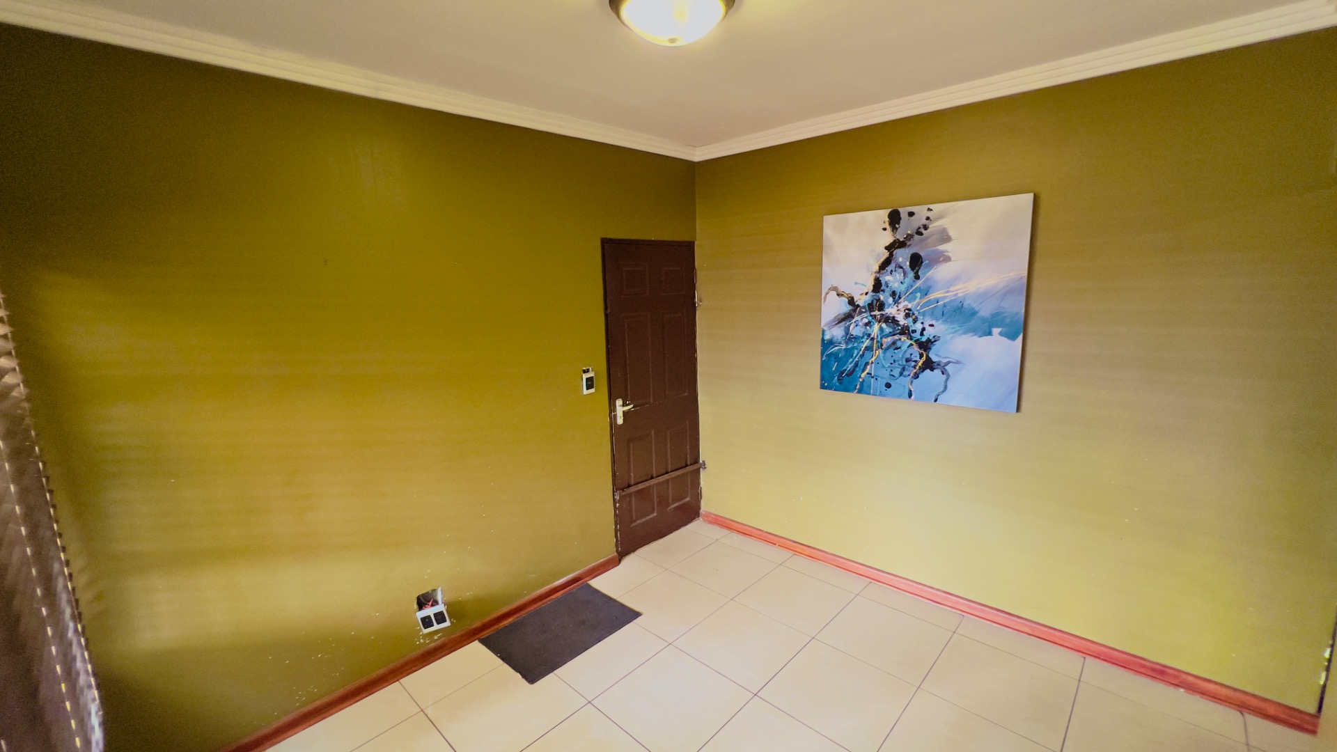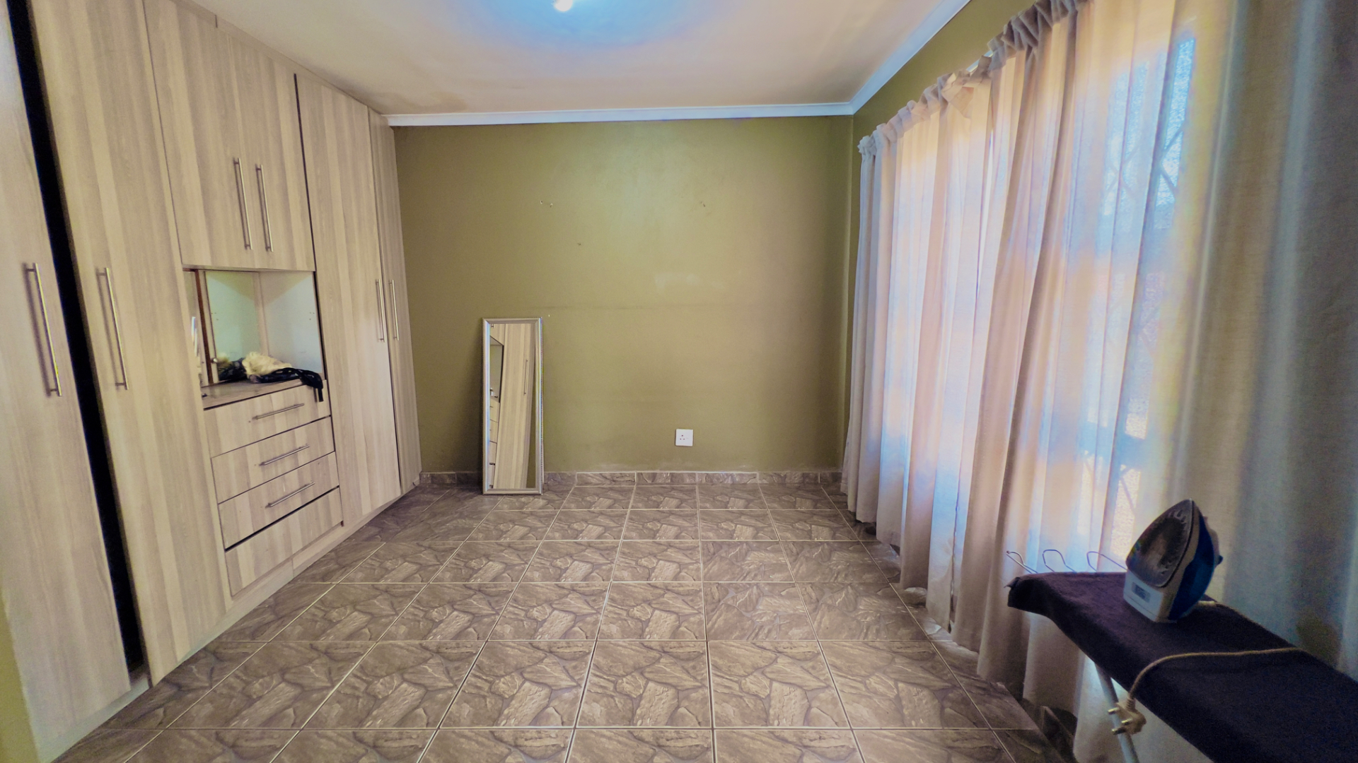 Inside, the home presents a practical and well-defined layout. The living spaces include a comfortable lounge and a dedicated dining room, providing ample area for relaxation and entertaining. The functional kitchen is ready to cater to your culinary needs. Throughout the main living areas, light-colored tiled flooring and a continuation of the olive-green wall palette create a cohesive and easy-to-maintain environment.