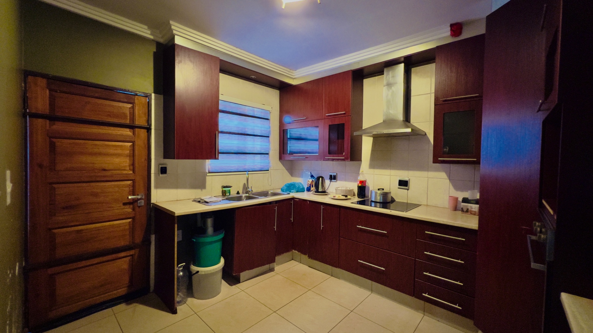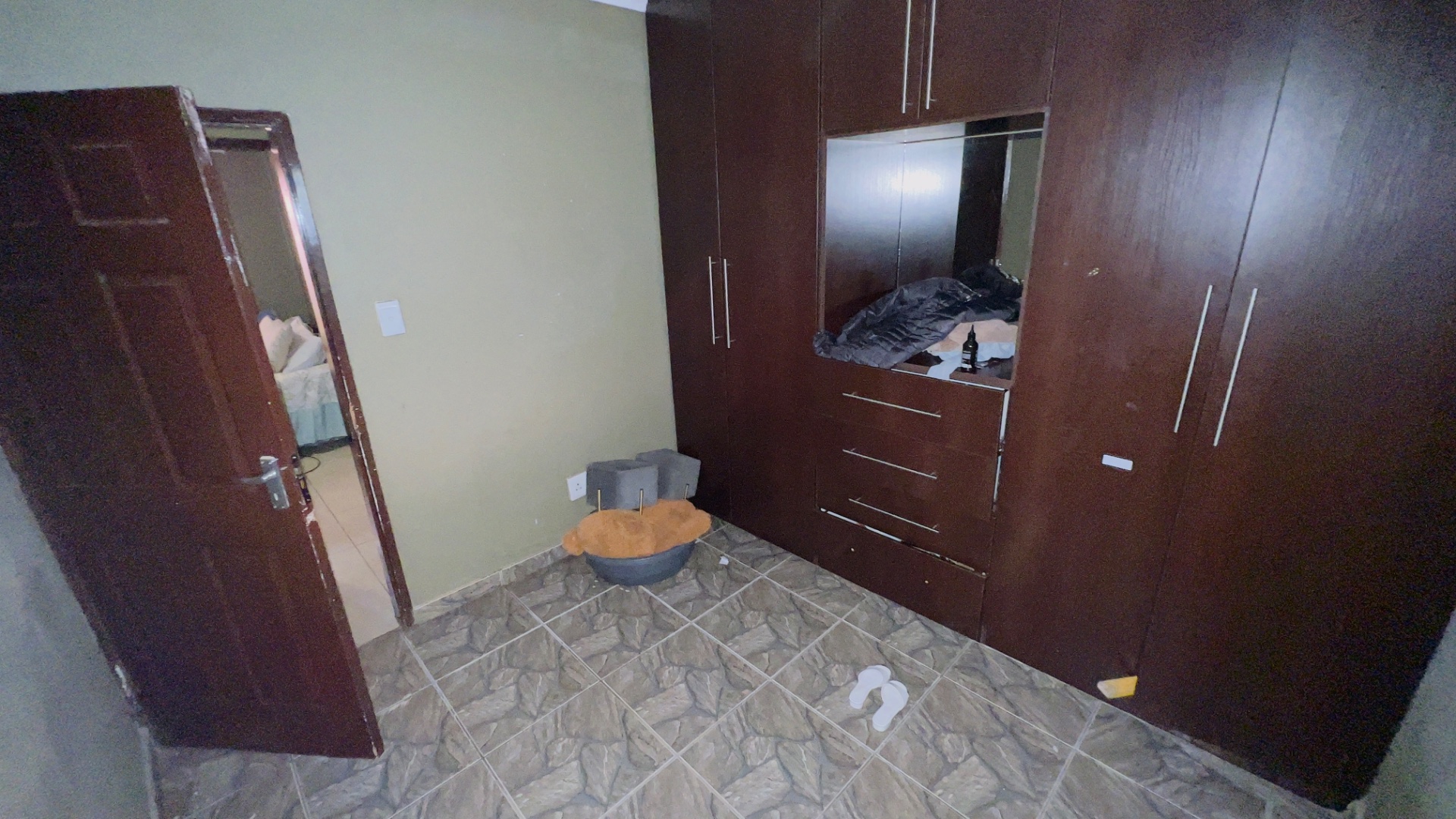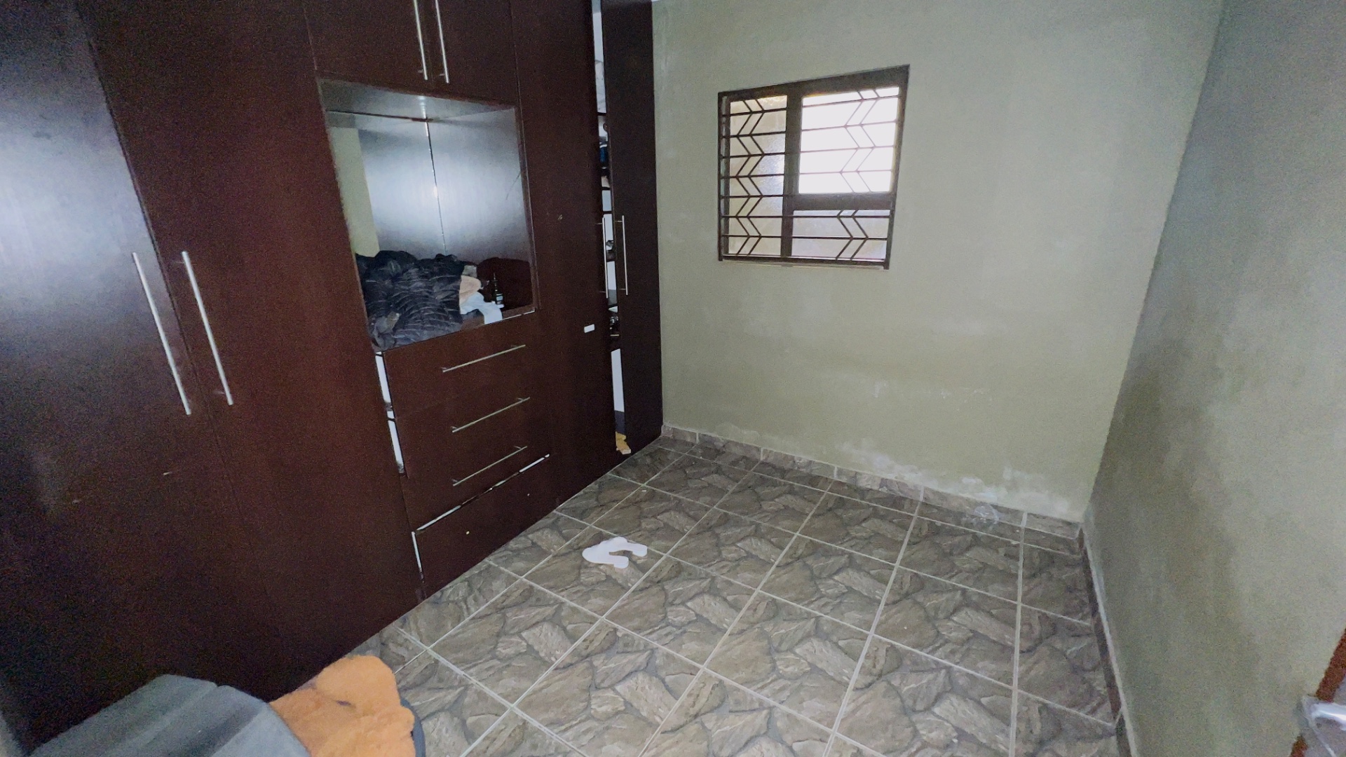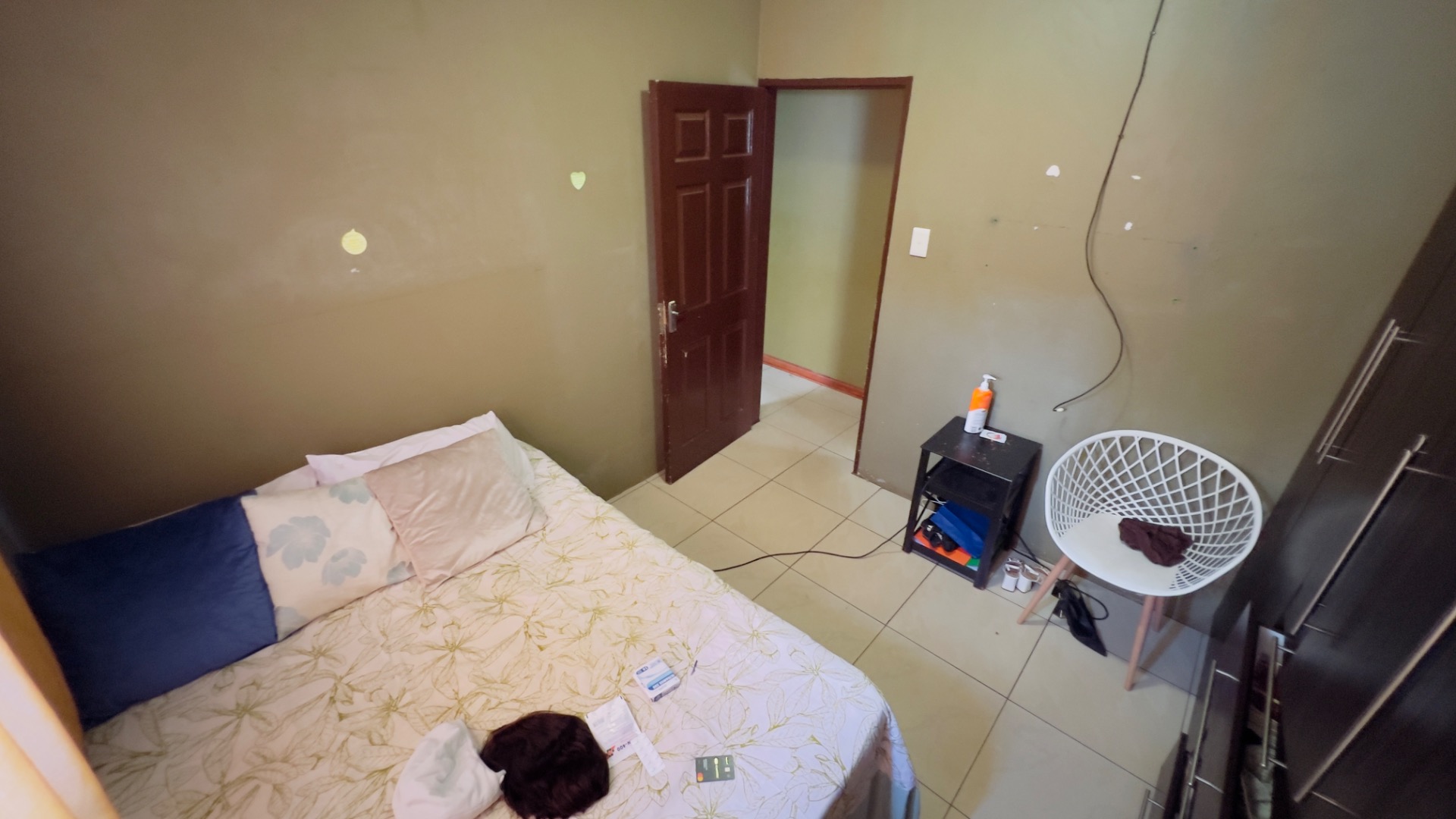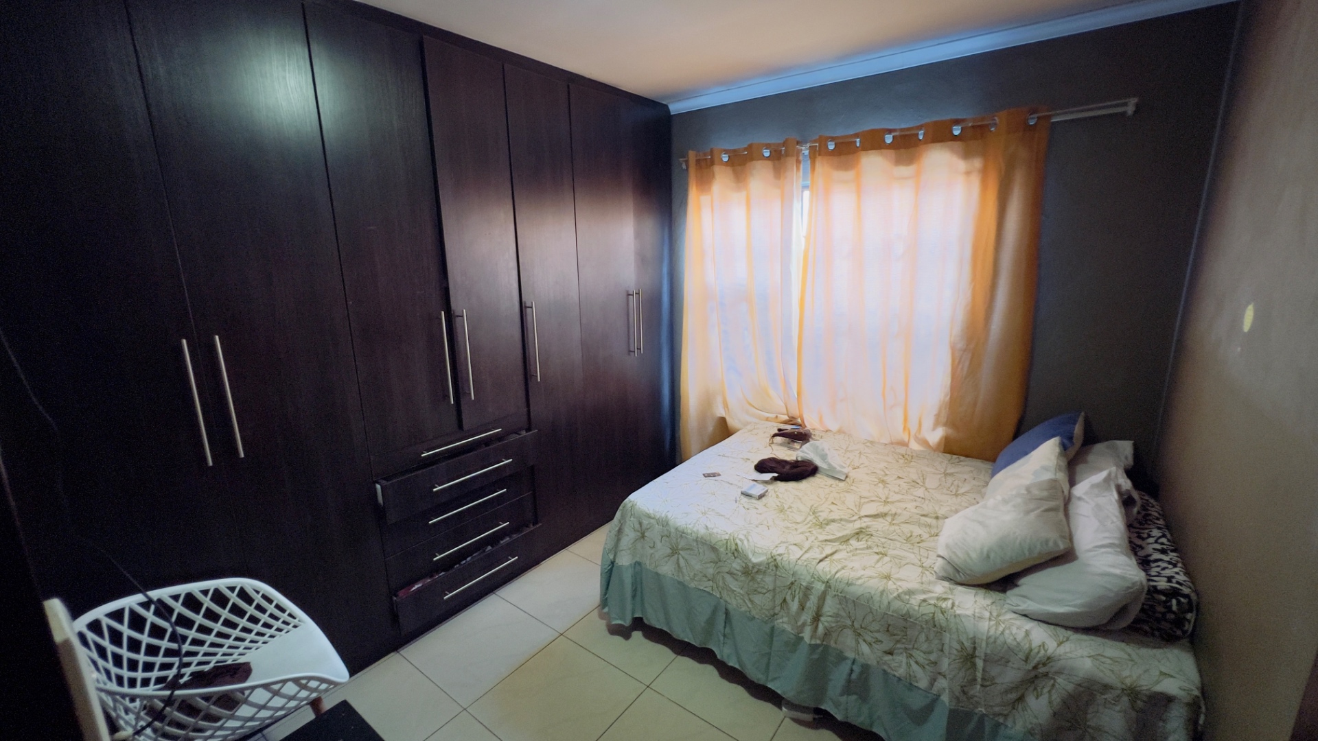 Inside, the home presents a practical and well-defined layout. The living spaces include a comfortable lounge and a dedicated dining room, providing ample area for relaxation and entertaining. The functional kitchen is ready to cater to your culinary needs. Throughout the main living areas, light-colored tiled flooring and a continuation of the olive-green wall palette create a cohesive and easy-to-maintain environment.