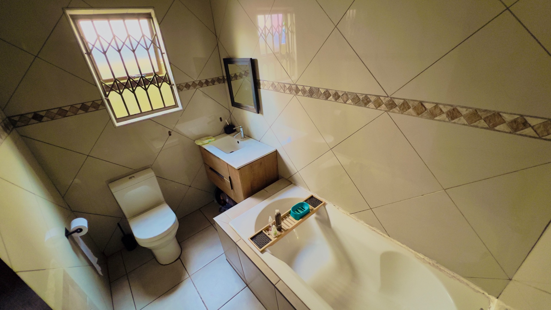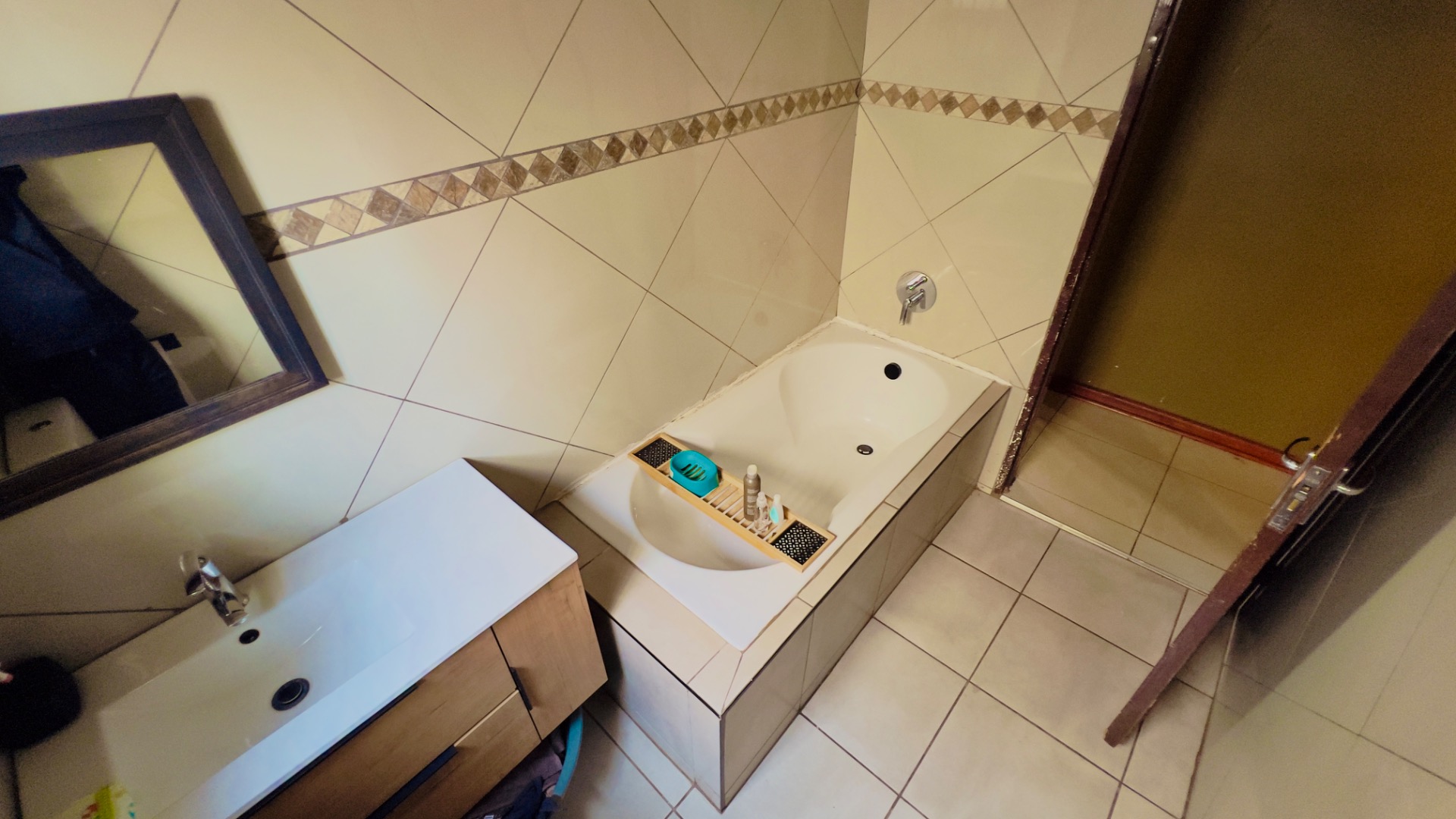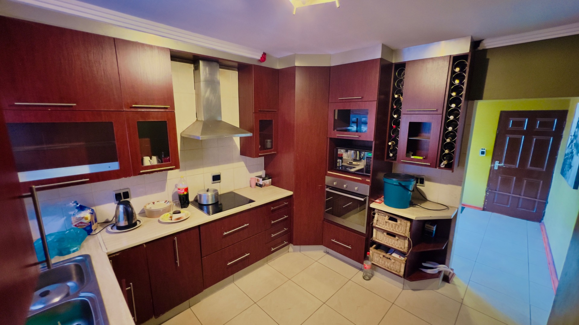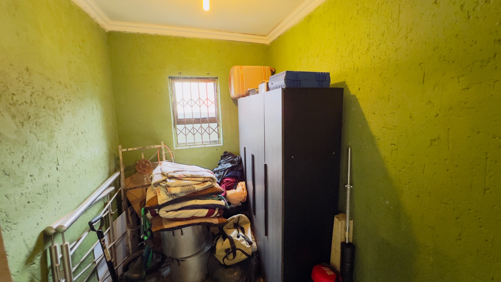 Inside, the home presents a practical and well-defined layout. The living spaces include a comfortable lounge and a dedicated dining room, providing ample area for relaxation and entertaining. The functional kitchen is ready to cater to your culinary needs. Throughout the main living areas, light-colored tiled flooring and a continuation of the olive-green wall palette create a cohesive and easy-to-maintain environment.