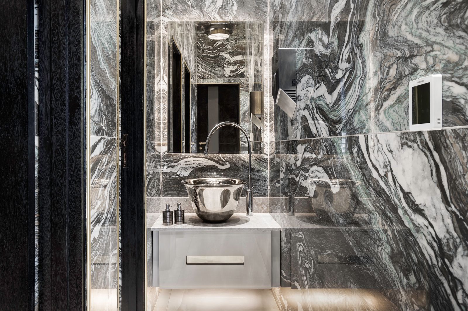 Monumental entrance with a sinking gate and Iconic statue , a cascading water feature and imported, book-matched marble walkway welcome you through the grand entrance, leading into spaces that celebrate artistry at every turn from the Versace-designed home office to the Roberto Cavalli spa and salon. The glass-encased five-car showroom showcases automotive perfection a collectors dream and a testament to refined taste.