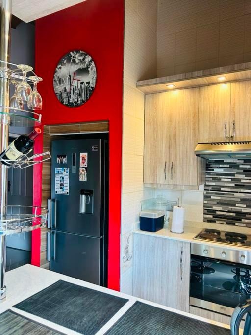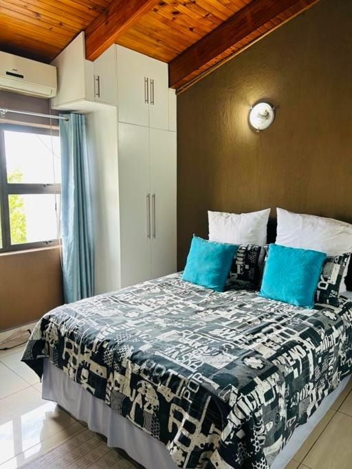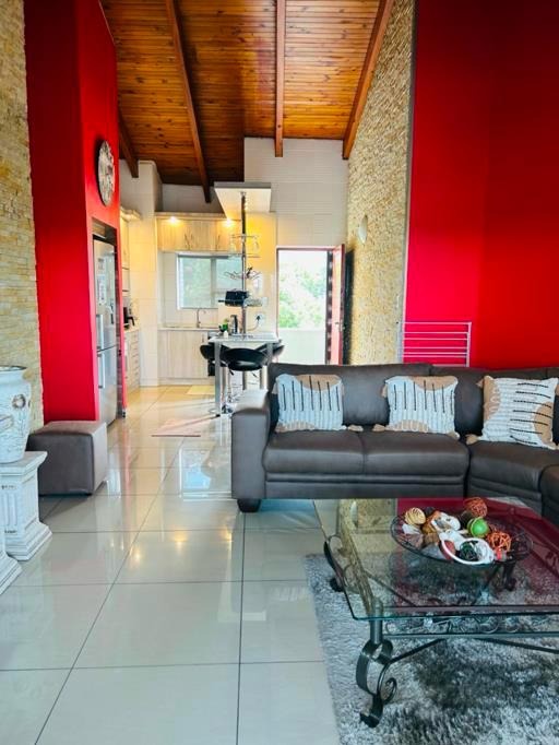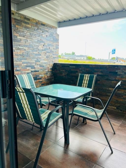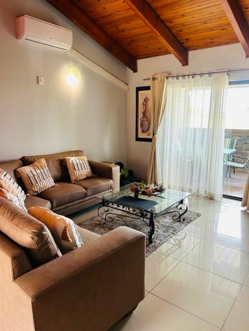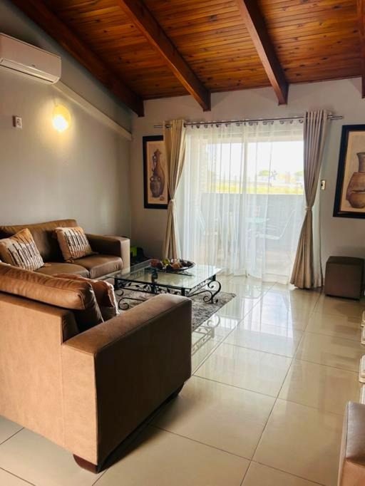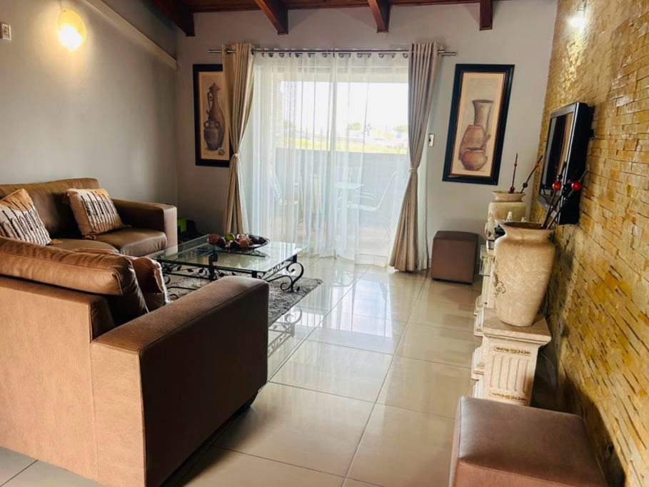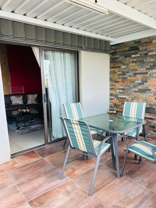 The apartment features an open-plan kitchen and living area that flows seamlessly onto a large private balcony with a built-in braai, perfect for relaxing or entertaining guests.