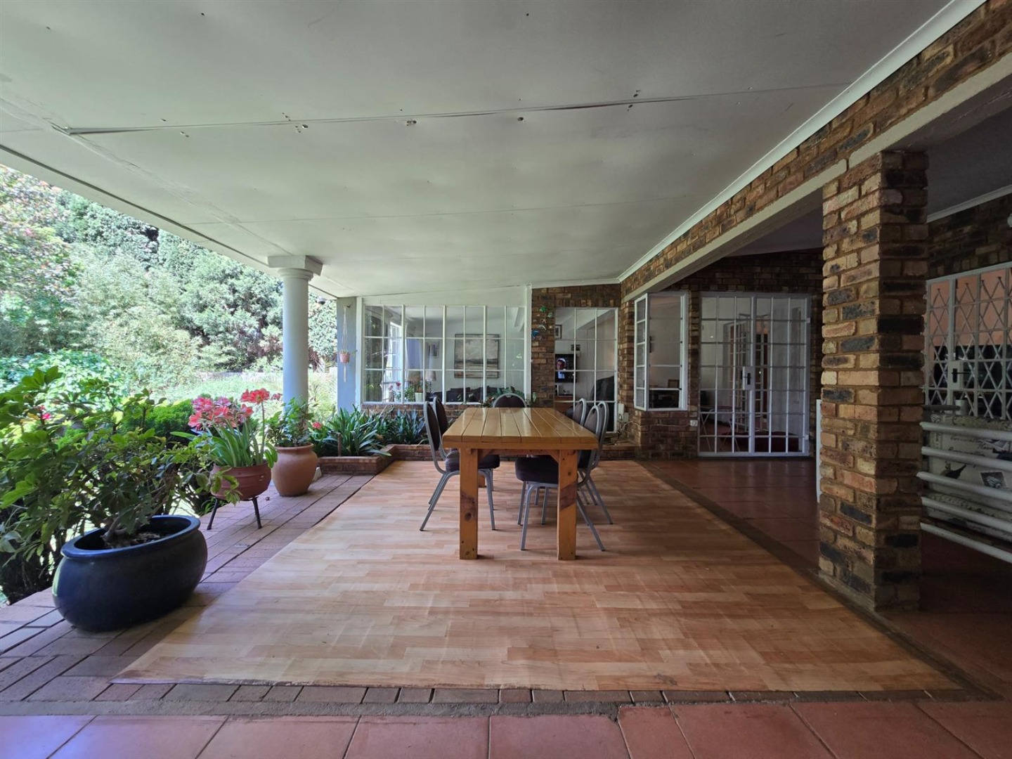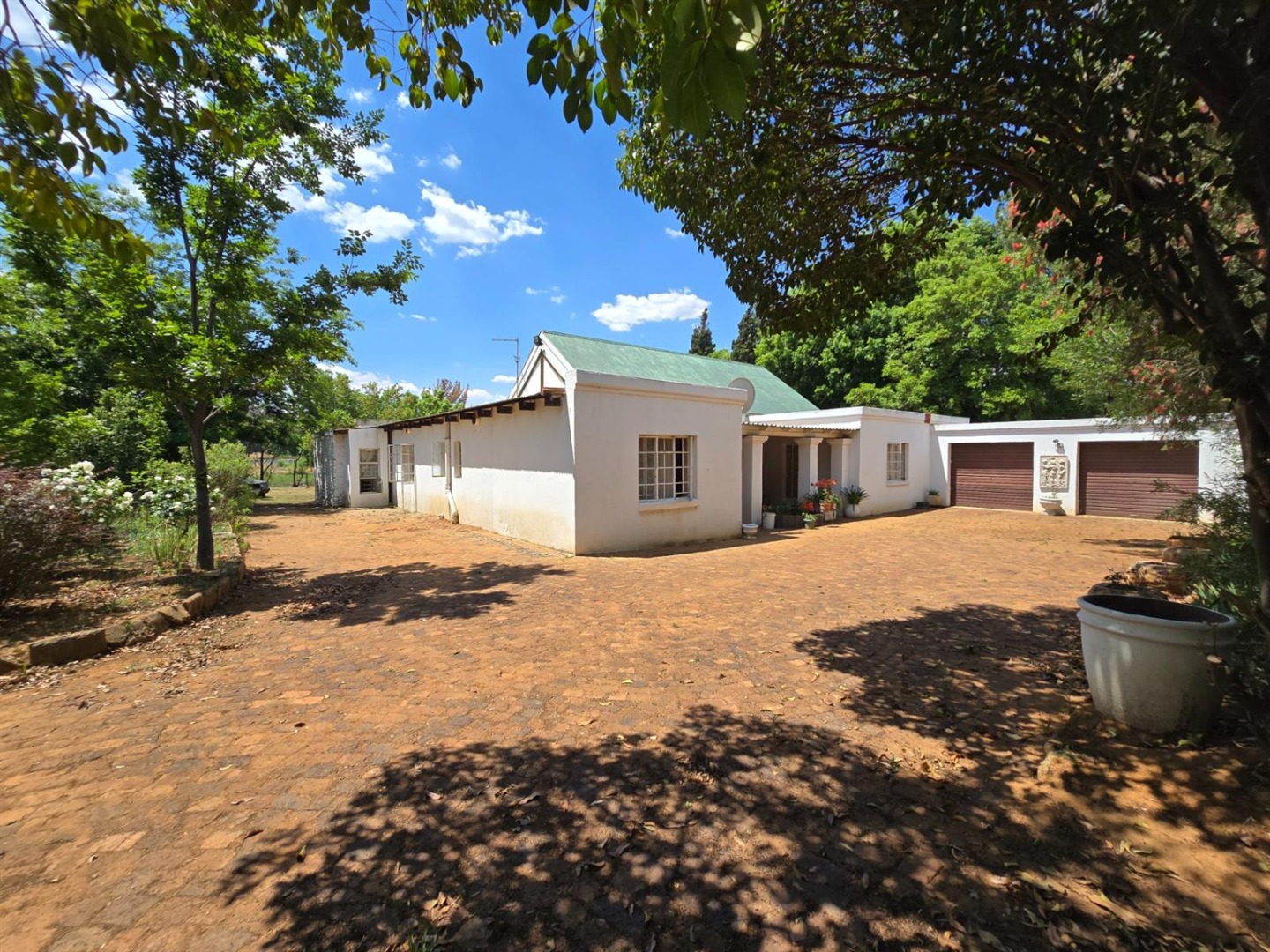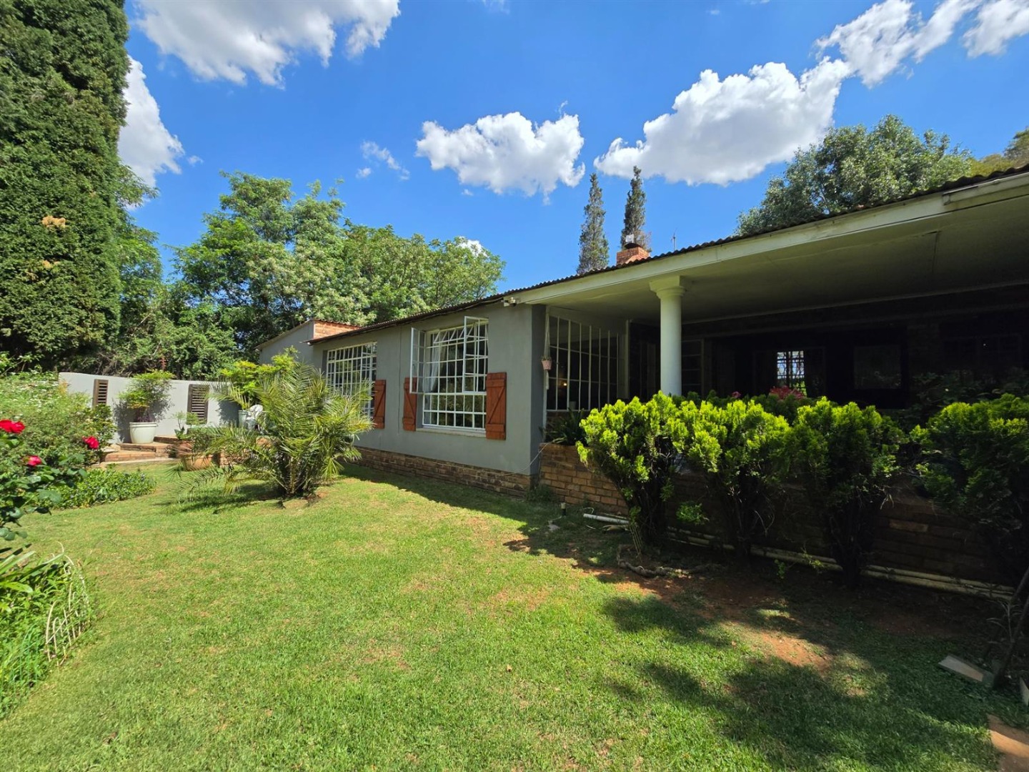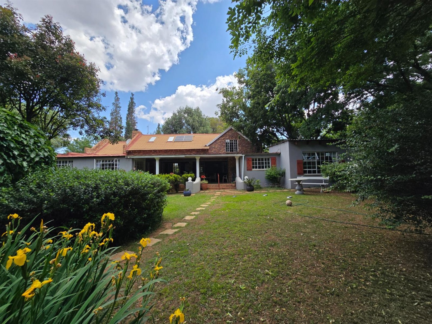 The main residence features three bedrooms, three bathrooms, a study or sunroom, spacious lounge with fireplace, dining area, country style kitchen with separate scullery, covered patio with dip pool, and a beautiful established garden with double garage.