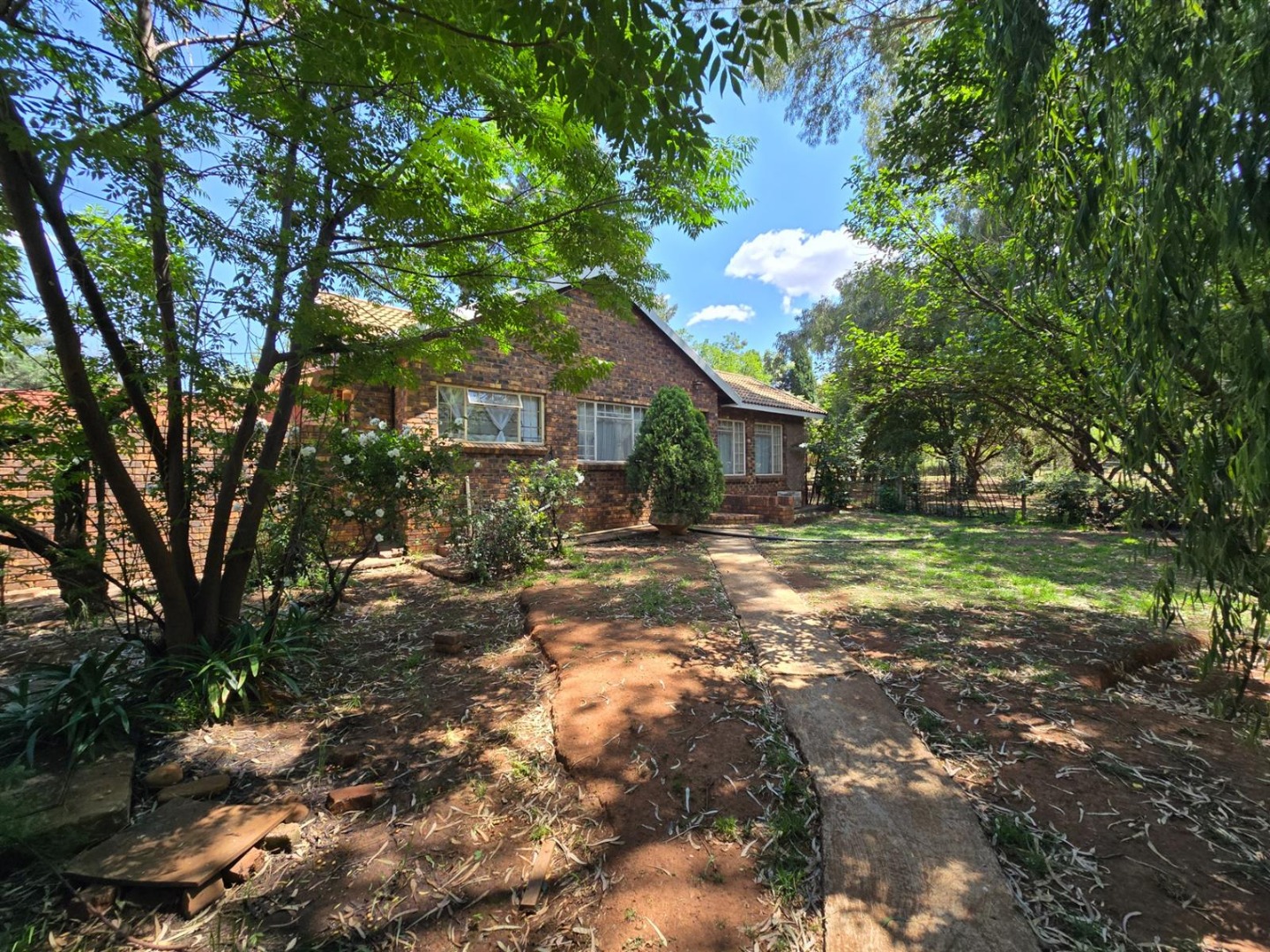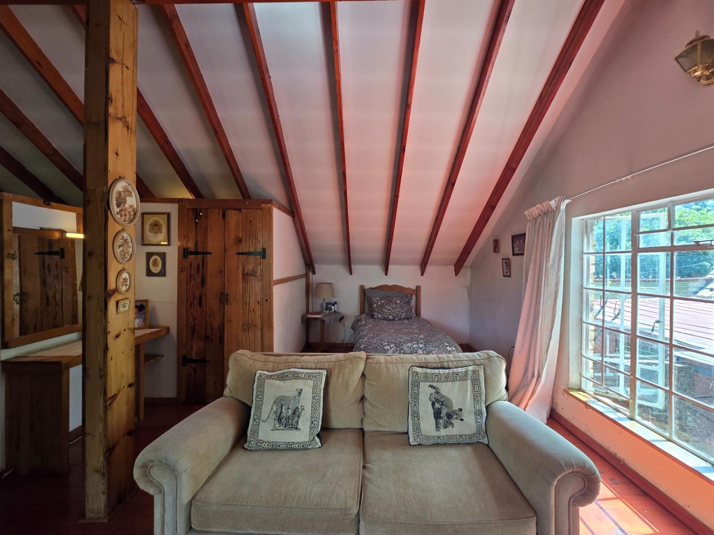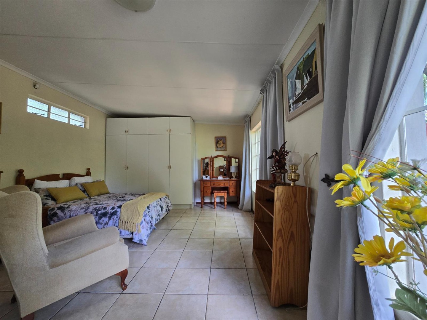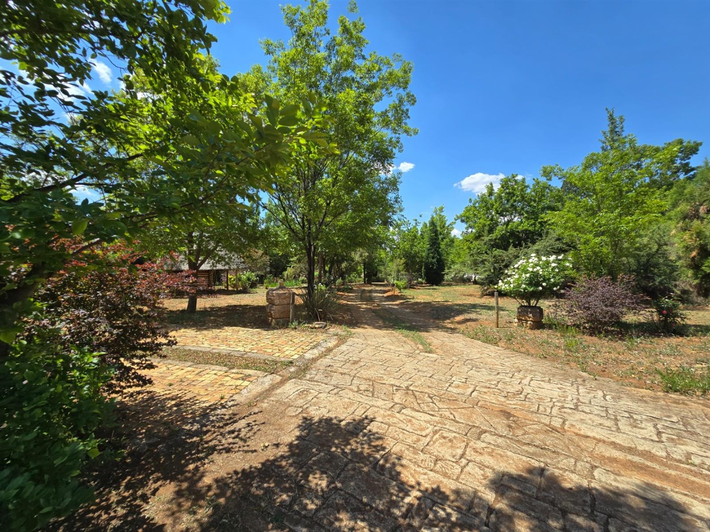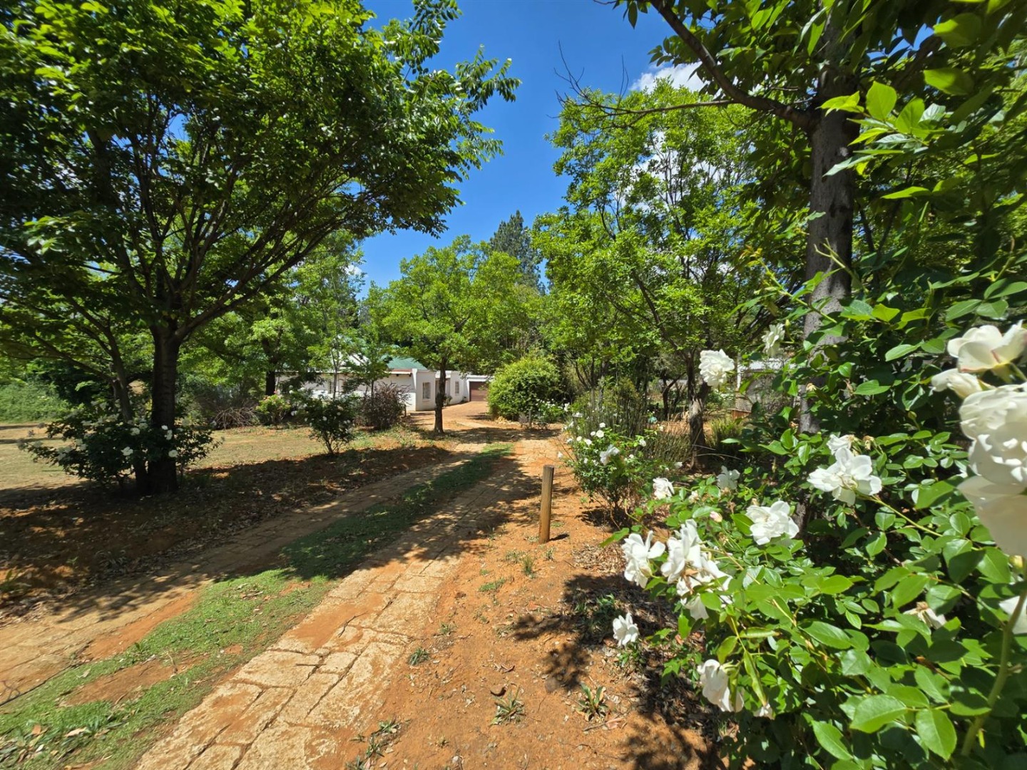 The main residence features three bedrooms, three bathrooms, a study or sunroom, spacious lounge with fireplace, dining area, country style kitchen with separate scullery, covered patio with dip pool, and a beautiful established garden with double garage.