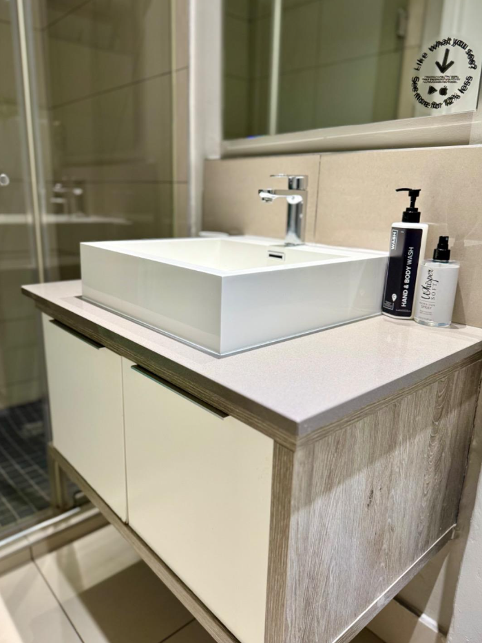 This contemporary studio apartment offers a sophisticated urban living experience in the vibrant Rosebank precinct of Johannesburg. Designed specifically for modern convenience, the unit presents a sleek, compact kitchen equipped with integrated appliances, including an oven, hob, microwave, and extractor fan. This culinary space is beautifully complemented by stylish two-tone cabinetry and focused under-cabinet lighting. The well-appointed bathroom boasts a luxurious glass-enclosed shower, a chic vessel sink, and a wall-mounted toilet, all expertly finished with modern fixtures and recessed lighting to create a clean aesthetic. Residents can also enjoy a valuable piece of private outdoor space on their personal balcony, which is perfect for quiet relaxation and fresh air.