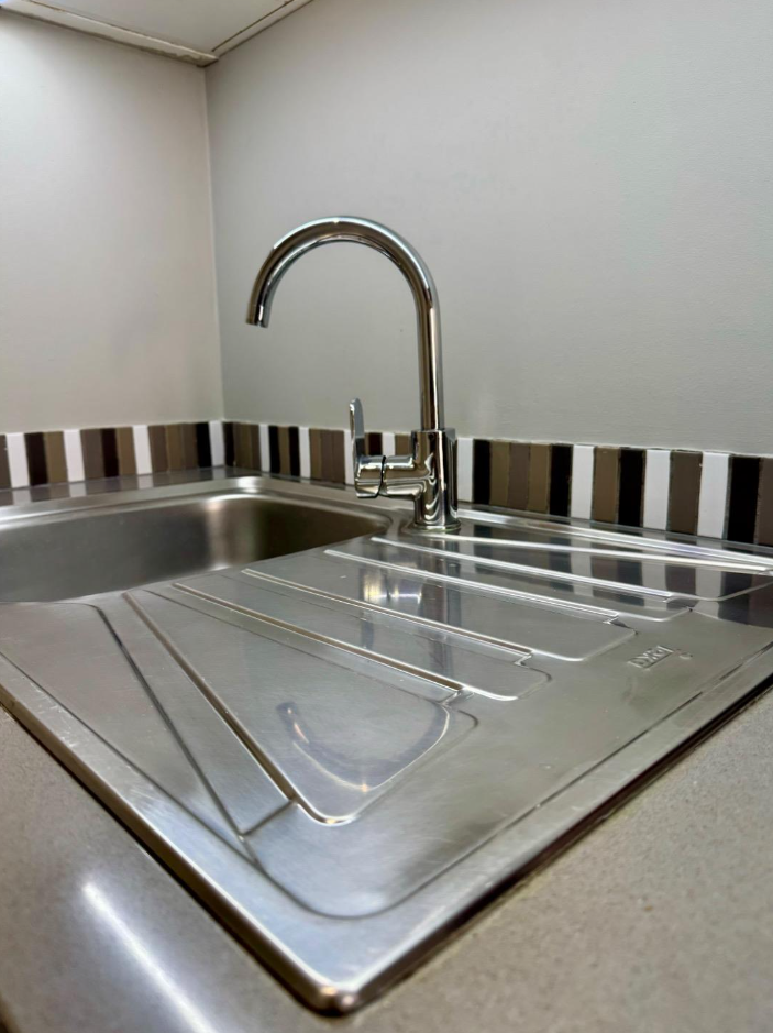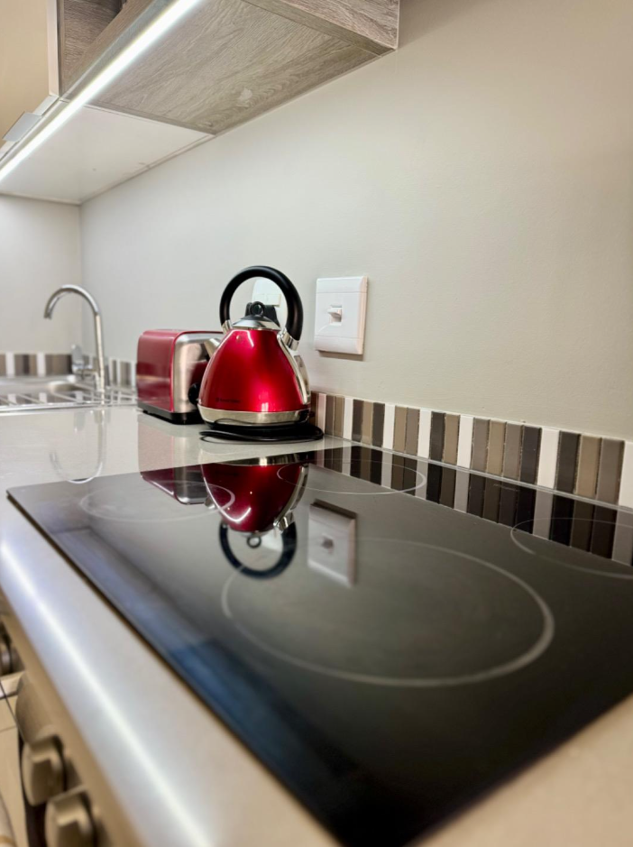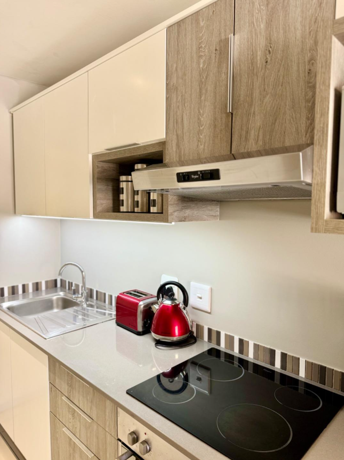 This contemporary studio apartment offers a sophisticated urban living experience in the vibrant Rosebank precinct of Johannesburg. Designed specifically for modern convenience, the unit presents a sleek, compact kitchen equipped with integrated appliances, including an oven, hob, microwave, and extractor fan. This culinary space is beautifully complemented by stylish two-tone cabinetry and focused under-cabinet lighting. The well-appointed bathroom boasts a luxurious glass-enclosed shower, a chic vessel sink, and a wall-mounted toilet, all expertly finished with modern fixtures and recessed lighting to create a clean aesthetic. Residents can also enjoy a valuable piece of private outdoor space on their personal balcony, which is perfect for quiet relaxation and fresh air.