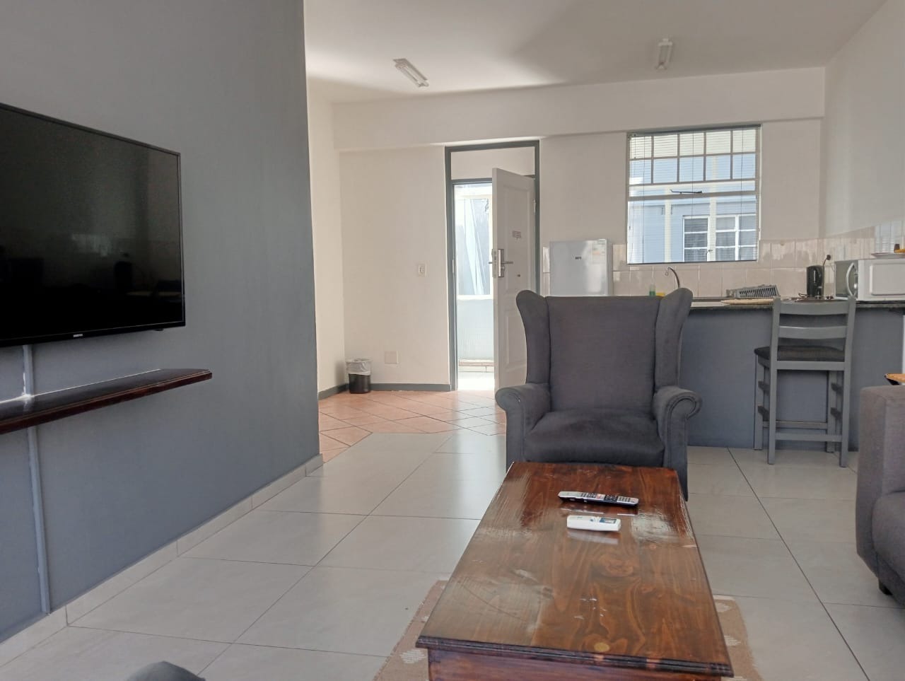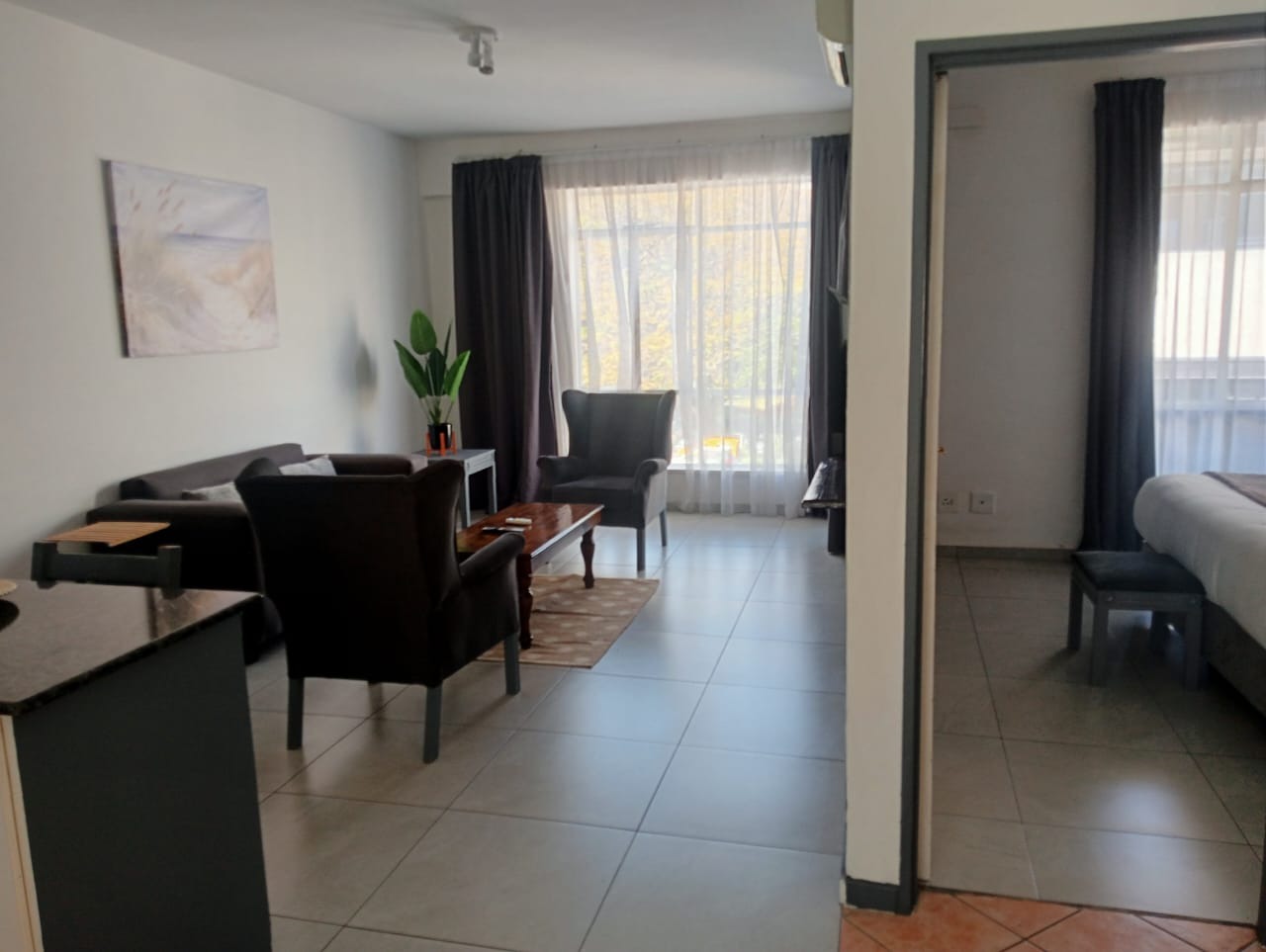 The apartment features a well-appointed lounge and a functional kitchen, all designed with a clean, modern aesthetic. Enjoy abundant natural light streaming through large windows, complemented by efficient air conditioning for year-round comfort. Tiled floors throughout ensure easy maintenance, while a private balcony provides scenic views, perfect for relaxation. The open layout thoughtfully connects the living area to the bedroom, creating a spacious feel.