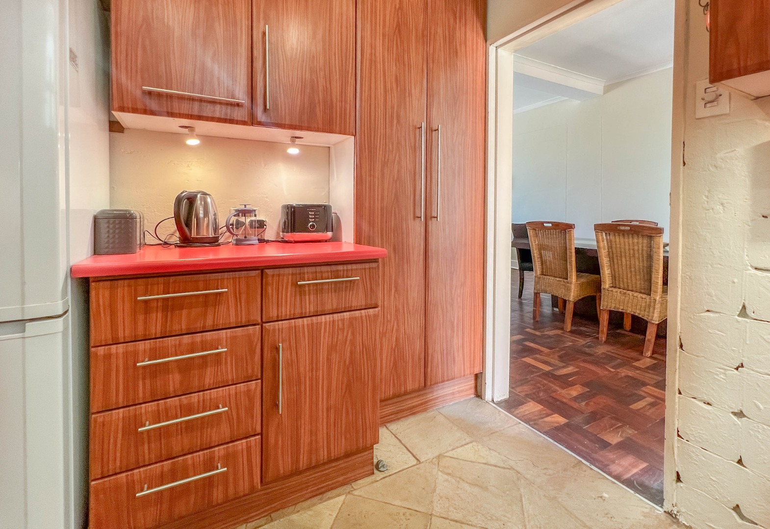 Modern separate kitchen with bold red counter tops – fully equipped and kitted for all your needs