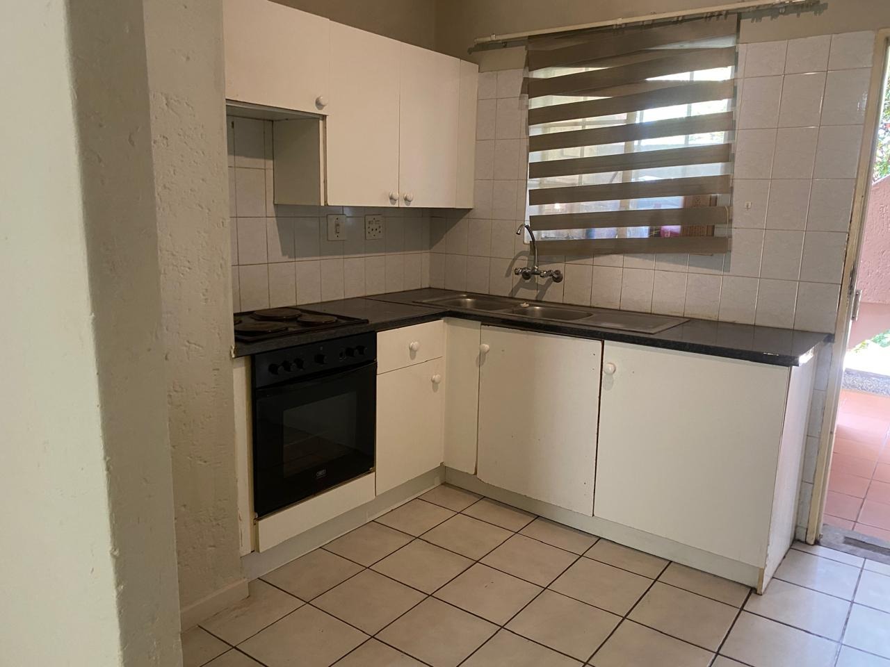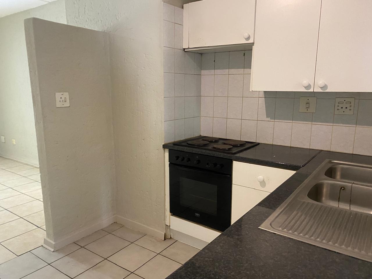 - Open-plan kitchen fitted with an electrical stove and double basin