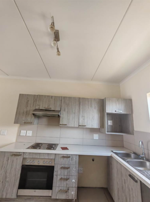 This contemporary 3-bedroom, 2-bathroom rental apartment in Carlswald, Midrand, offers a comfortable and modern living experience. The open-plan living and dining areas feature durable tiled flooring and neutral walls, providing a versatile space. The modern kitchen is well-equipped with light wood-grain cabinets, white countertops, a built-in oven, hob, extractor fan, double sink, and a stylish island with storage. A private balcony, accessible via sliding glass doors, extends the living space outdoors.