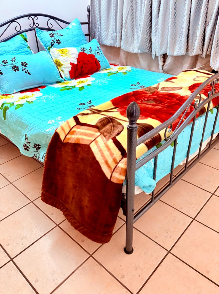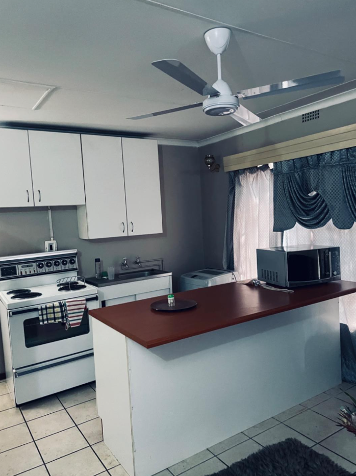 The interior boasts durable tiled flooring throughout and features a highly functional kitchen. This space is equipped with modern white upper cabinetry, a freestanding electric stove, a sink, and a central island counter. For added convenience, the kitchen includes both a washing machine and a microwave. The adjacent lounge area is versatile and bright, offering a dedicated desk space and receiving substantial natural light. The bedroom provides comfortable accommodation, furnished with a metal-framed bed and ample storage via a spacious built-in wardrobe.