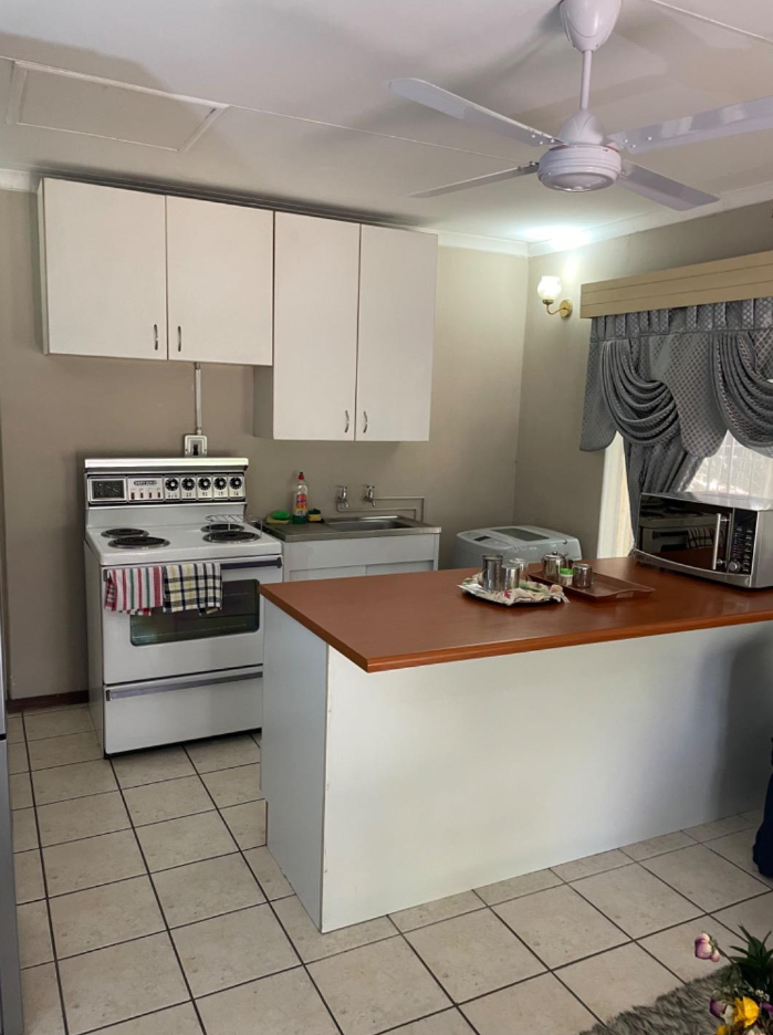 The interior boasts durable tiled flooring throughout and features a highly functional kitchen. This space is equipped with modern white upper cabinetry, a freestanding electric stove, a sink, and a central island counter. For added convenience, the kitchen includes both a washing machine and a microwave. The adjacent lounge area is versatile and bright, offering a dedicated desk space and receiving substantial natural light. The bedroom provides comfortable accommodation, furnished with a metal-framed bed and ample storage via a spacious built-in wardrobe.