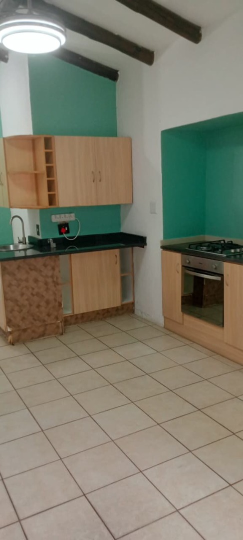 The residence is thoughtfully laid out for convenience and comfort, featuring a welcoming lounge, a defined dining room area, and a functional, well-equipped kitchen. Unique vaulted ceilings with exposed wooden beams enhance the character and spaciousness of the interior, while durable tiled flooring runs throughout the main living spaces. The modern kitchen is designed with light wood-look cabinetry, contrasted by dark countertops, and includes a built-in hob and oven to meet all your cooking requirements.