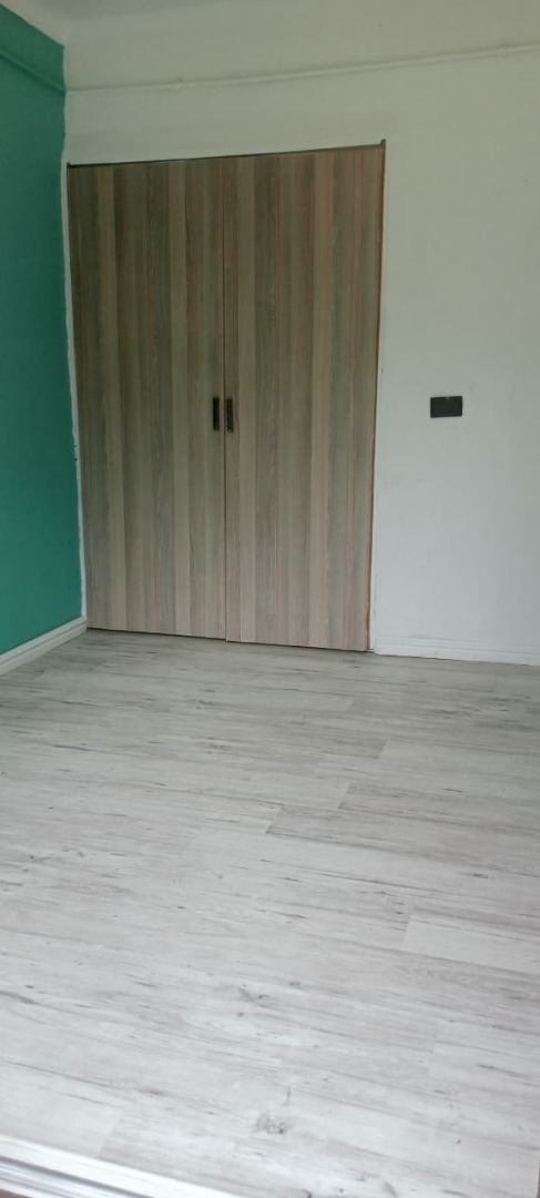 Abundant natural light streams into the living areas through large glass doors, which are fitted with security gates for peace of mind. The bedroom maintains a clean, contemporary aesthetic with light wood-look laminate flooring and features a generous built-in wardrobe for excellent storage capacity.