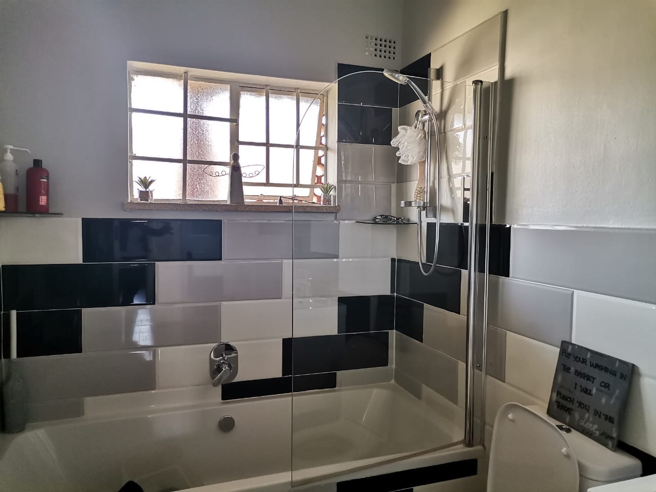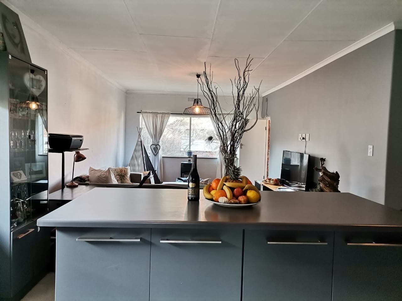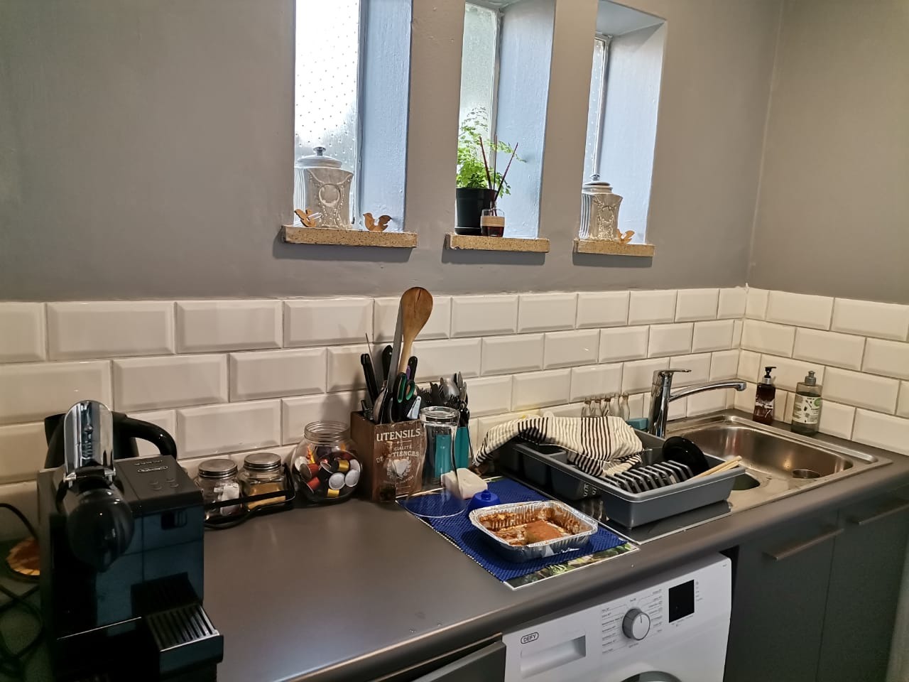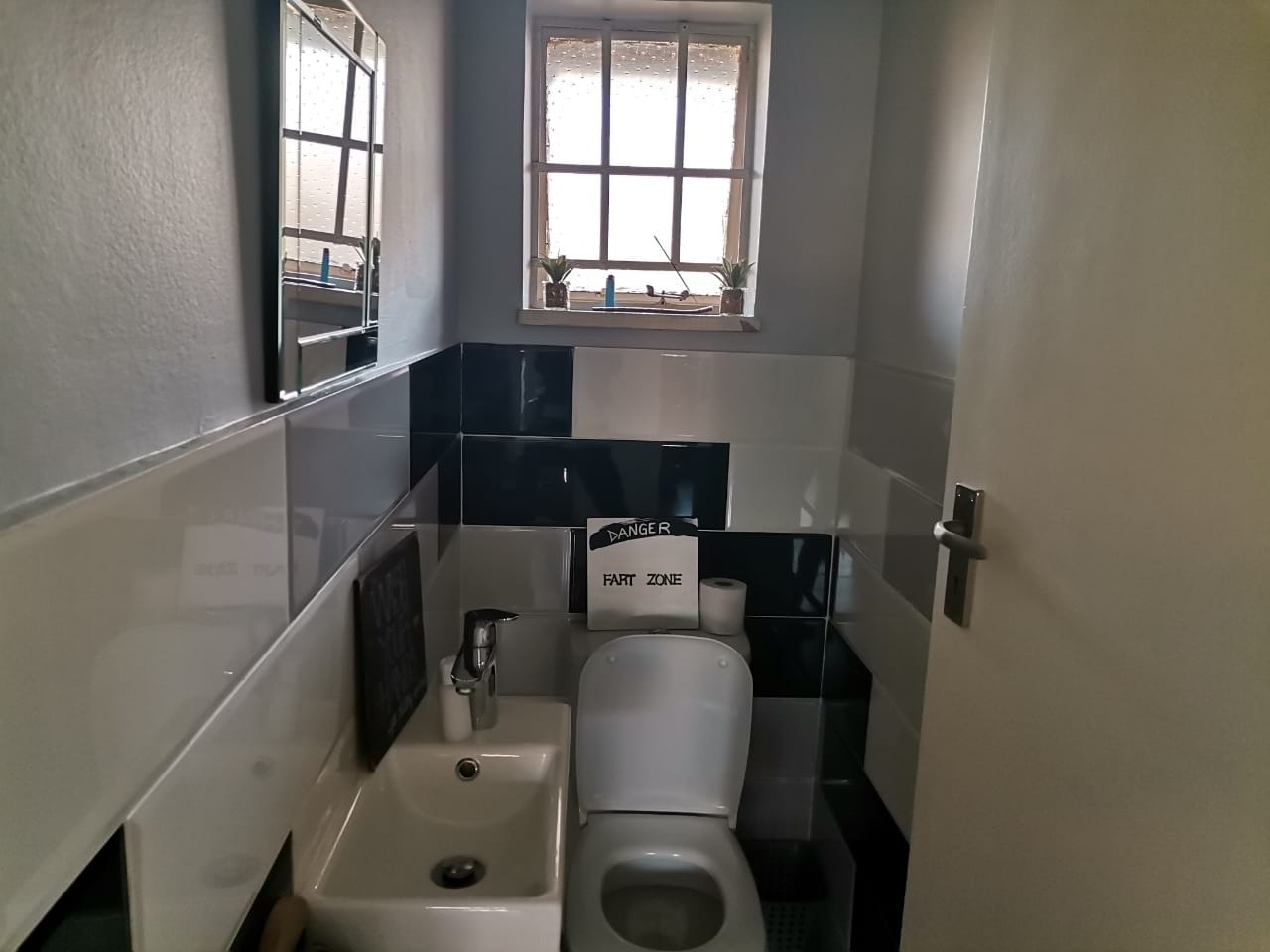 The tiled kitchen is well laid out and equipped with a standard stove, complemented by a separate tiled scullery for added functionality and discreet storage.