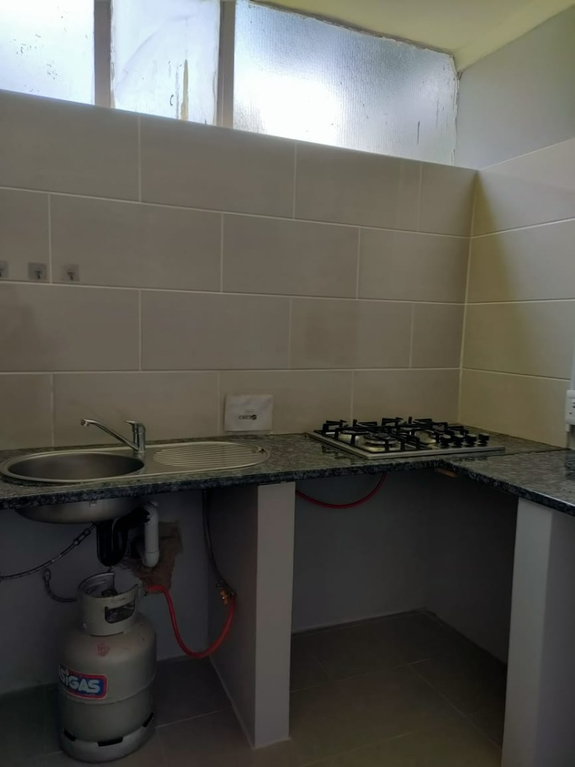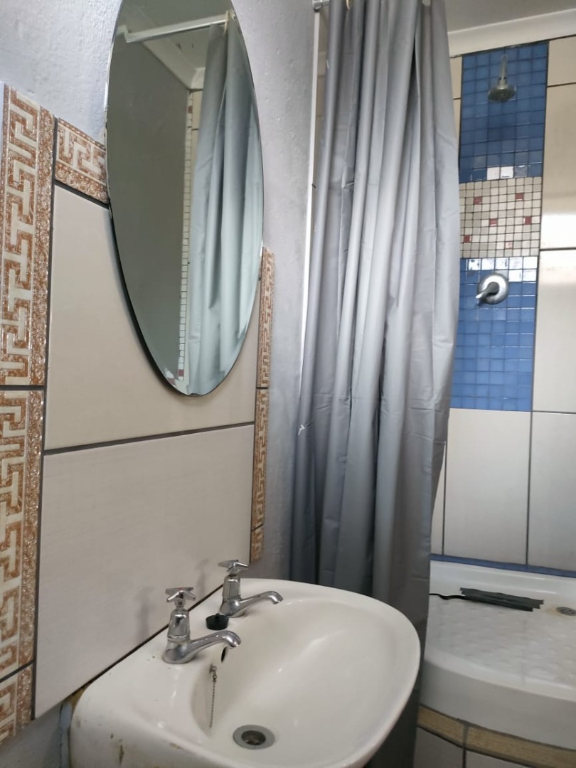 This inviting home is thoughtfully designed for efficient living, featuring a combined lounge area and a well-appointed kitchen. The interior is bathed in abundant natural light flowing through multiple windows and is finished with practical, modern tiled flooring throughout, ensuring a clean and bright aesthetic. The functional kitchen has been upgraded with a new countertop and sink, offering a practical space for meal preparation, complemented by a tiled backsplash. Adjacent to the living area, the property includes a full bathroom equipped with a pedestal sink, mirror, and a corner shower unit, providing all essential amenities.
