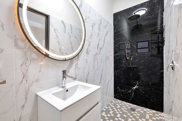 The bathroom is privately enclosed and fitted with a sleek modern walk-in shower (no bathtub), offering practicality with a refined finish.